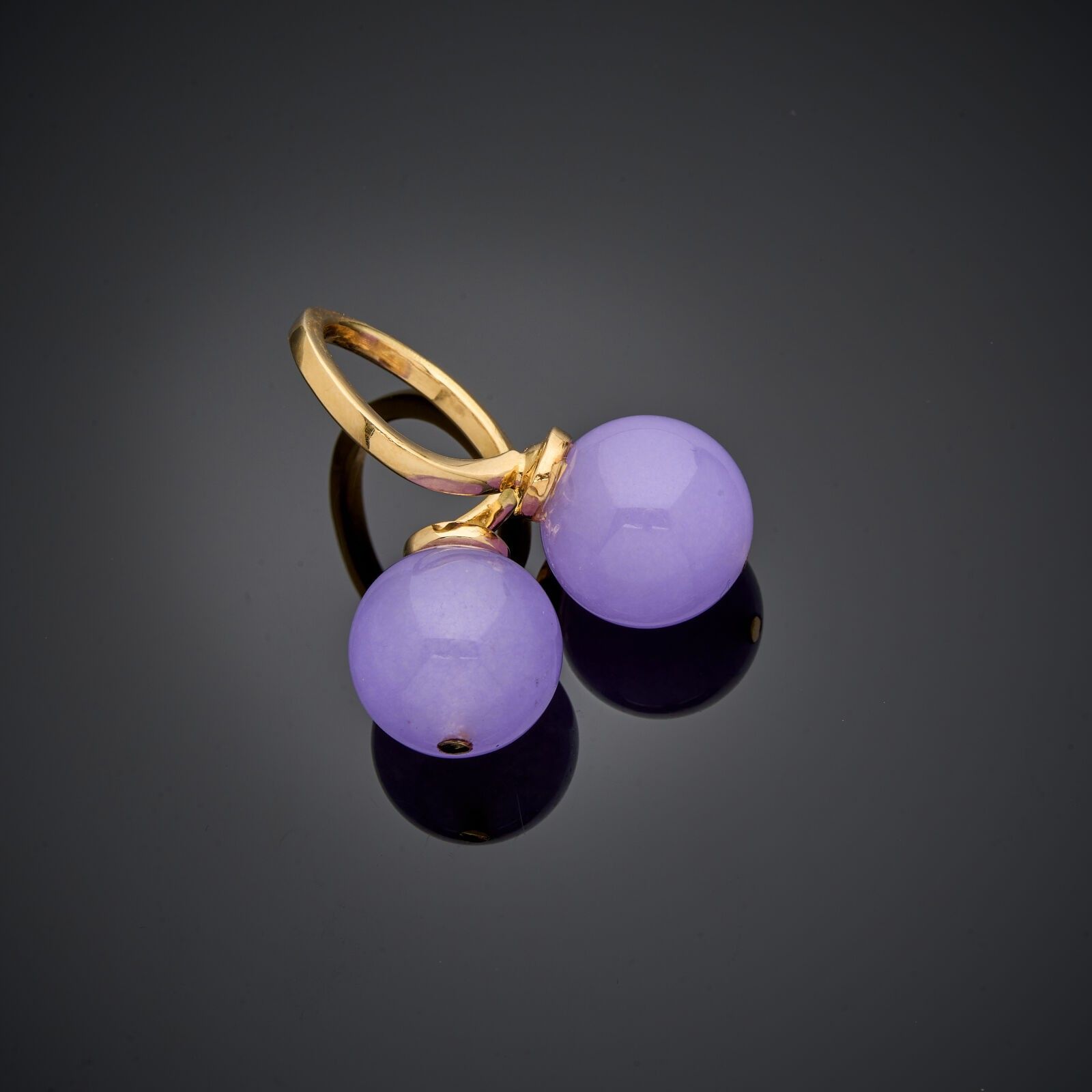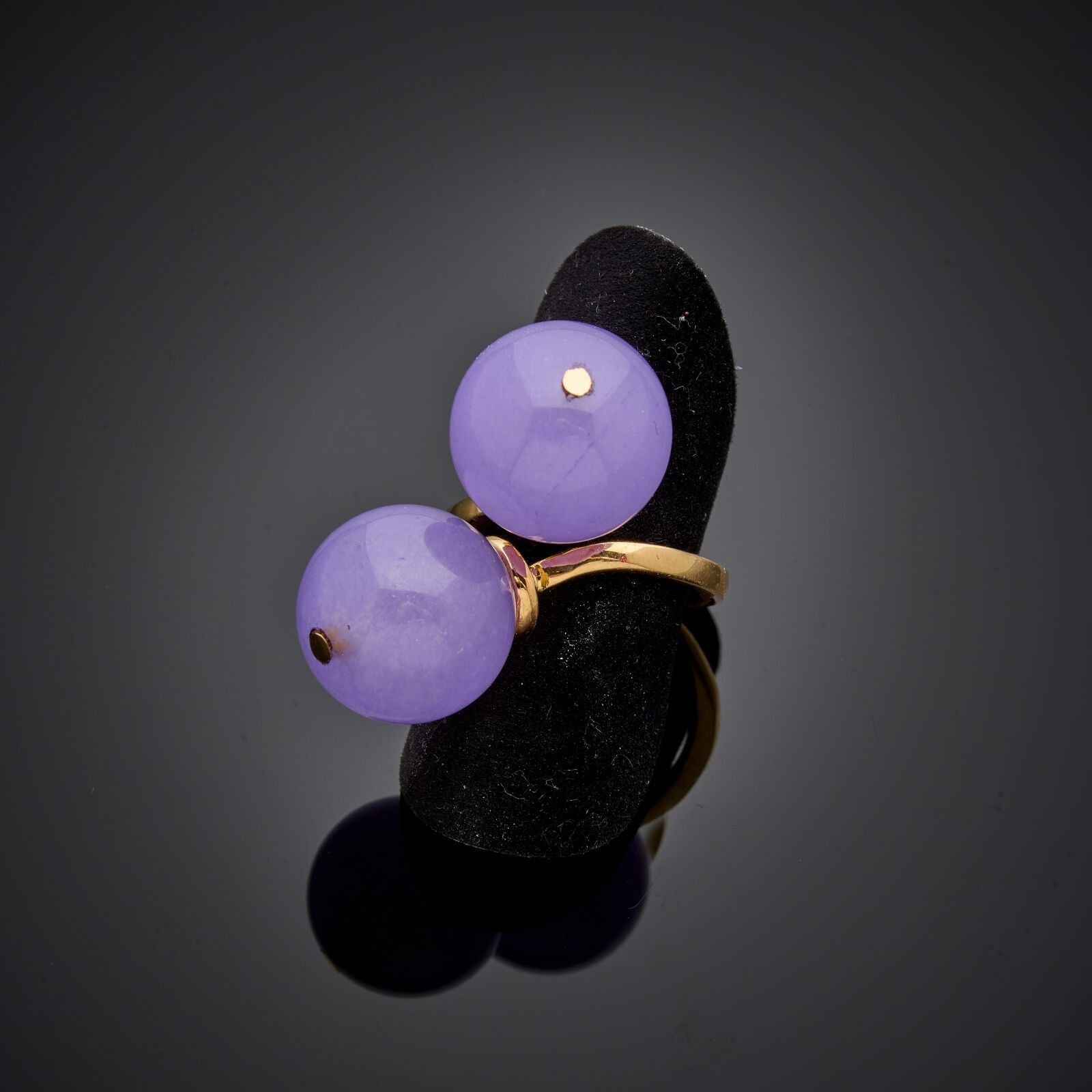 18 k (750 thousandths) yellow gold ring set with two amethyst balls.