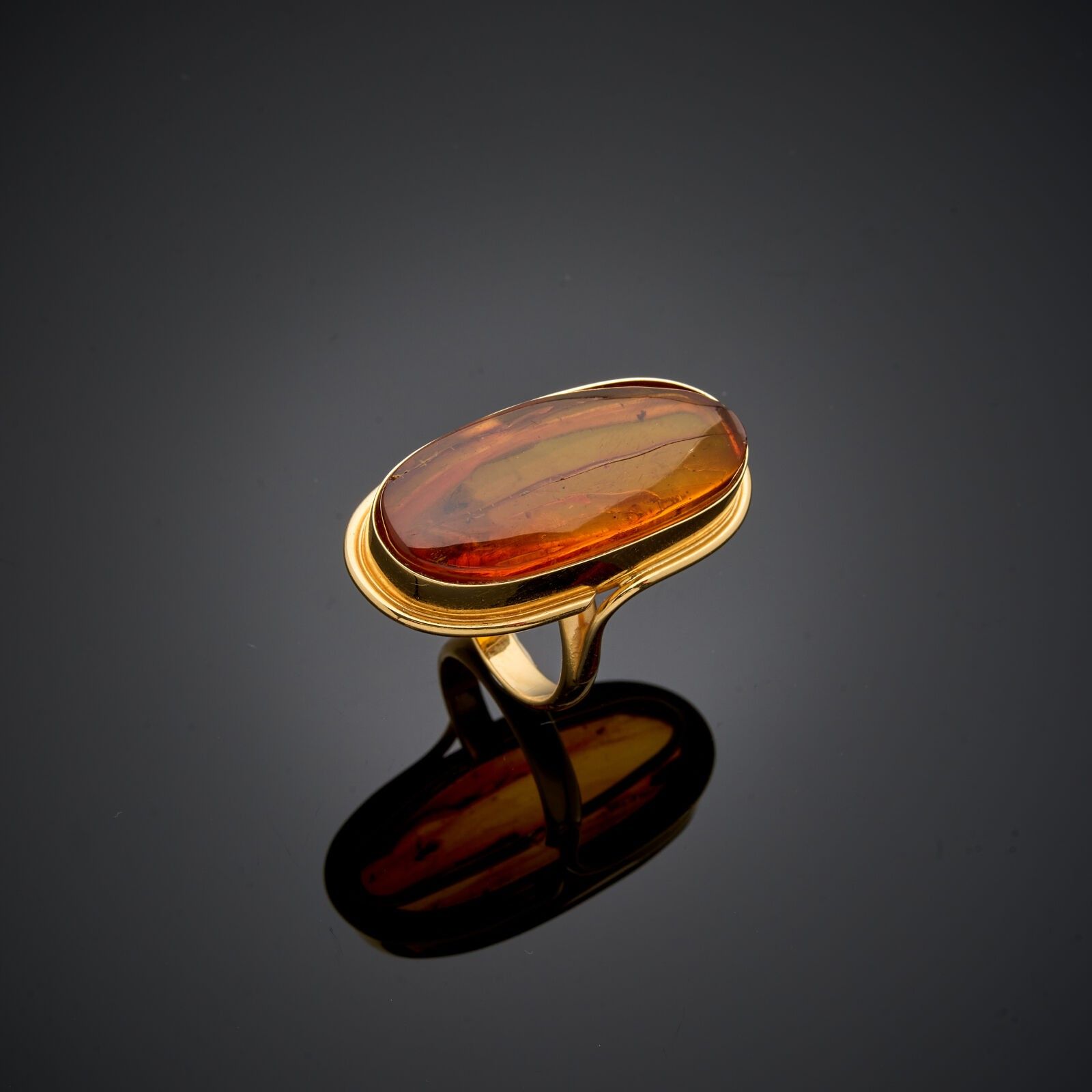 18 k (750 thousandths) yellow gold ring set with a large oval amber cabochon containing an insect.