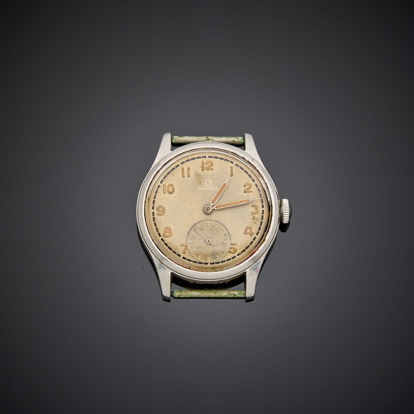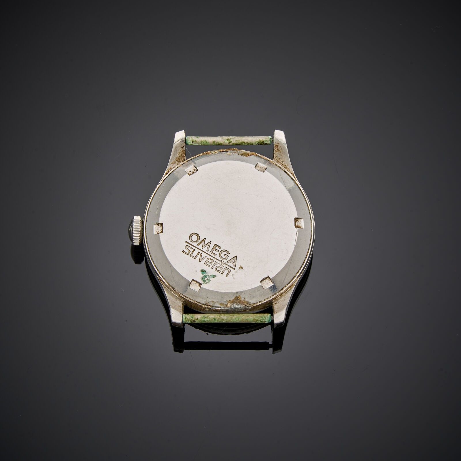 OMEGA - Rare Suveran model watch for Sweden circa 1940-1945, in steel, round case, dial with original beige patina with Arabic numerals which have retained their original radium. Original "syringe" hands, second hand at 6 o'clock. Steel case with the inscription "Omega Suveran" on the back (worn, to be serviced).