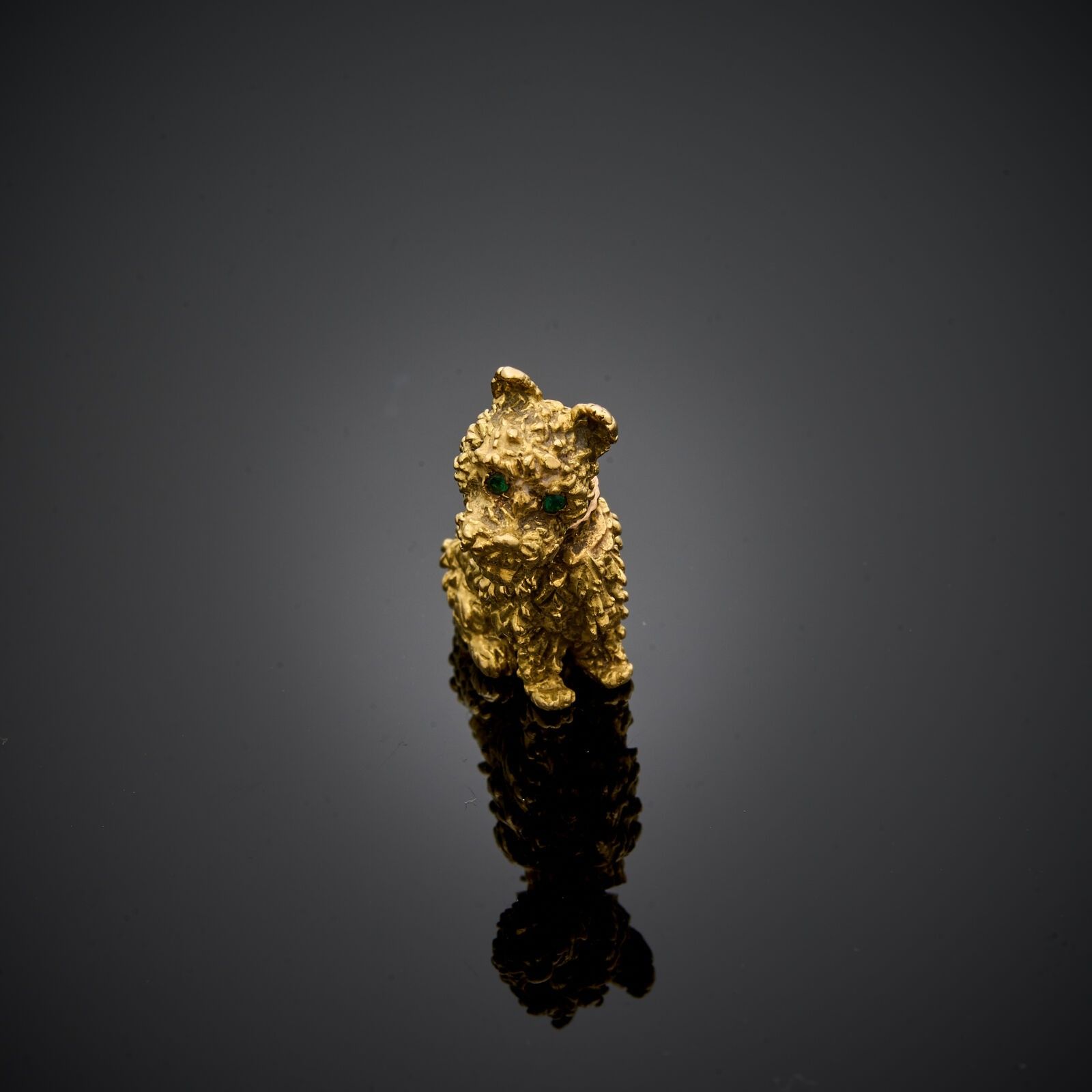 Natural 18 k (750 thousandths) yellow gold dog charm with movable head and green glass eyes.