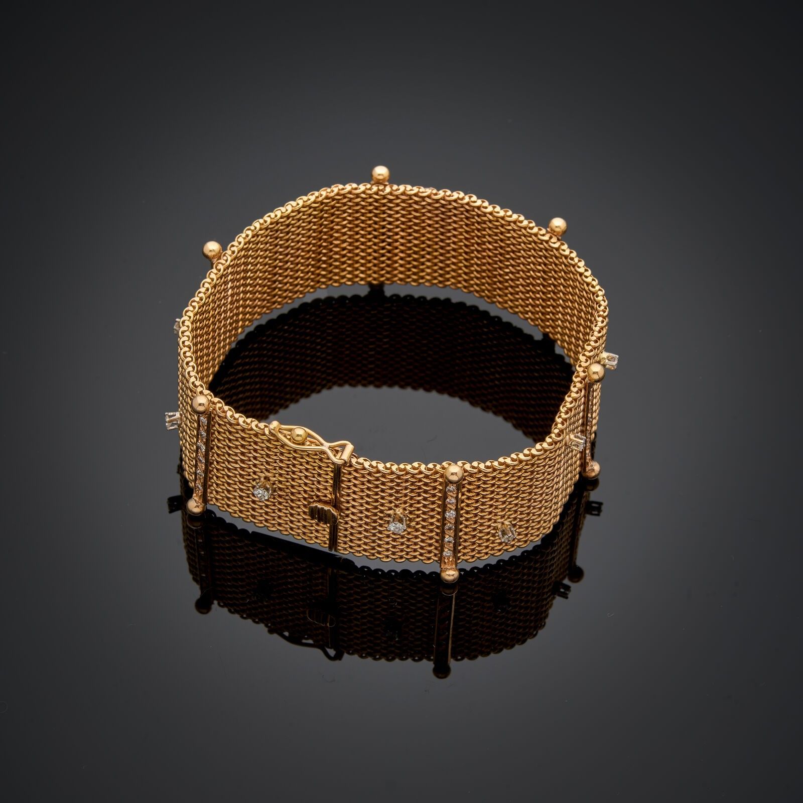 Articulated ribbon bracelet in 18k (750 thousandths) yellow gold set with diamonds between six bars of calibrated diamonds.