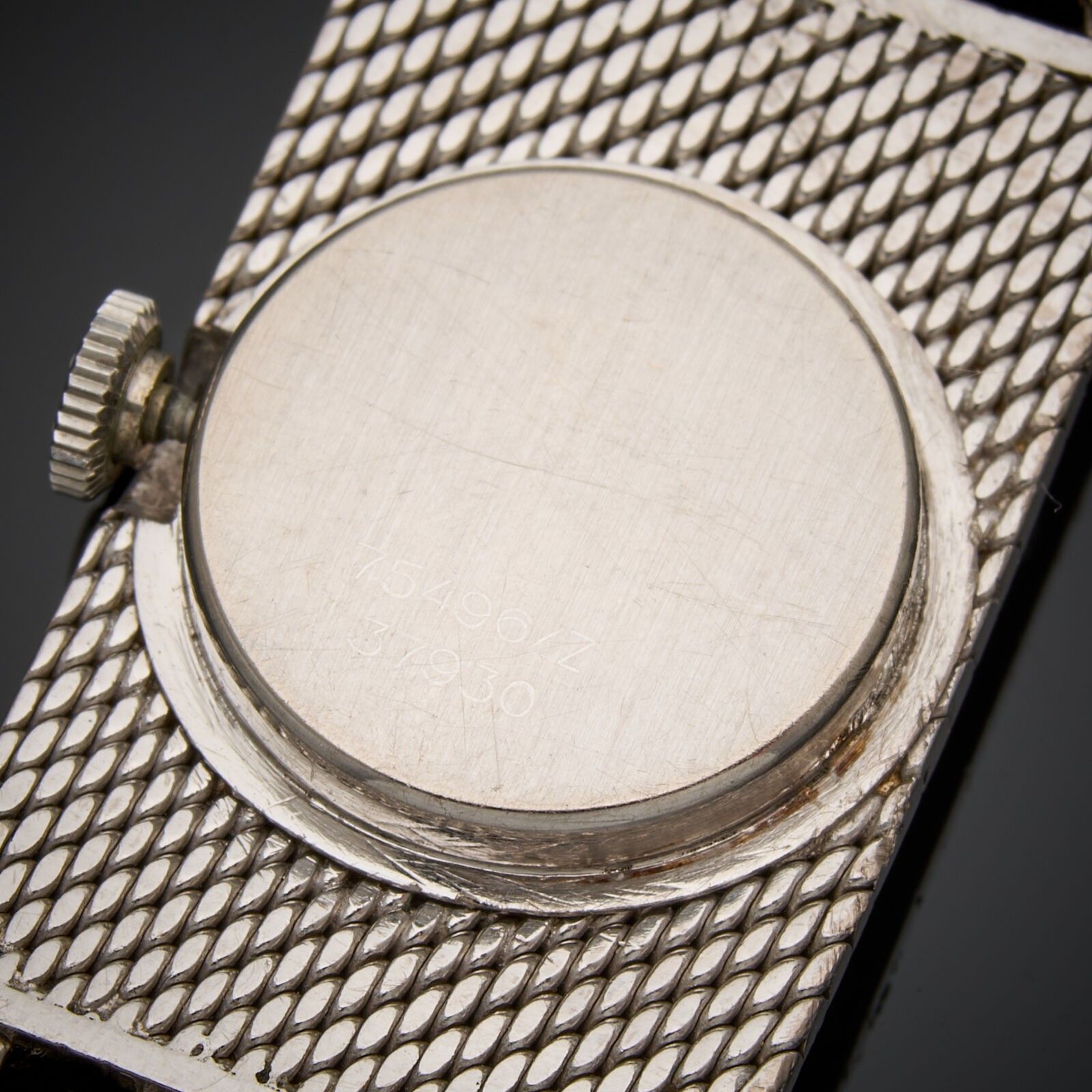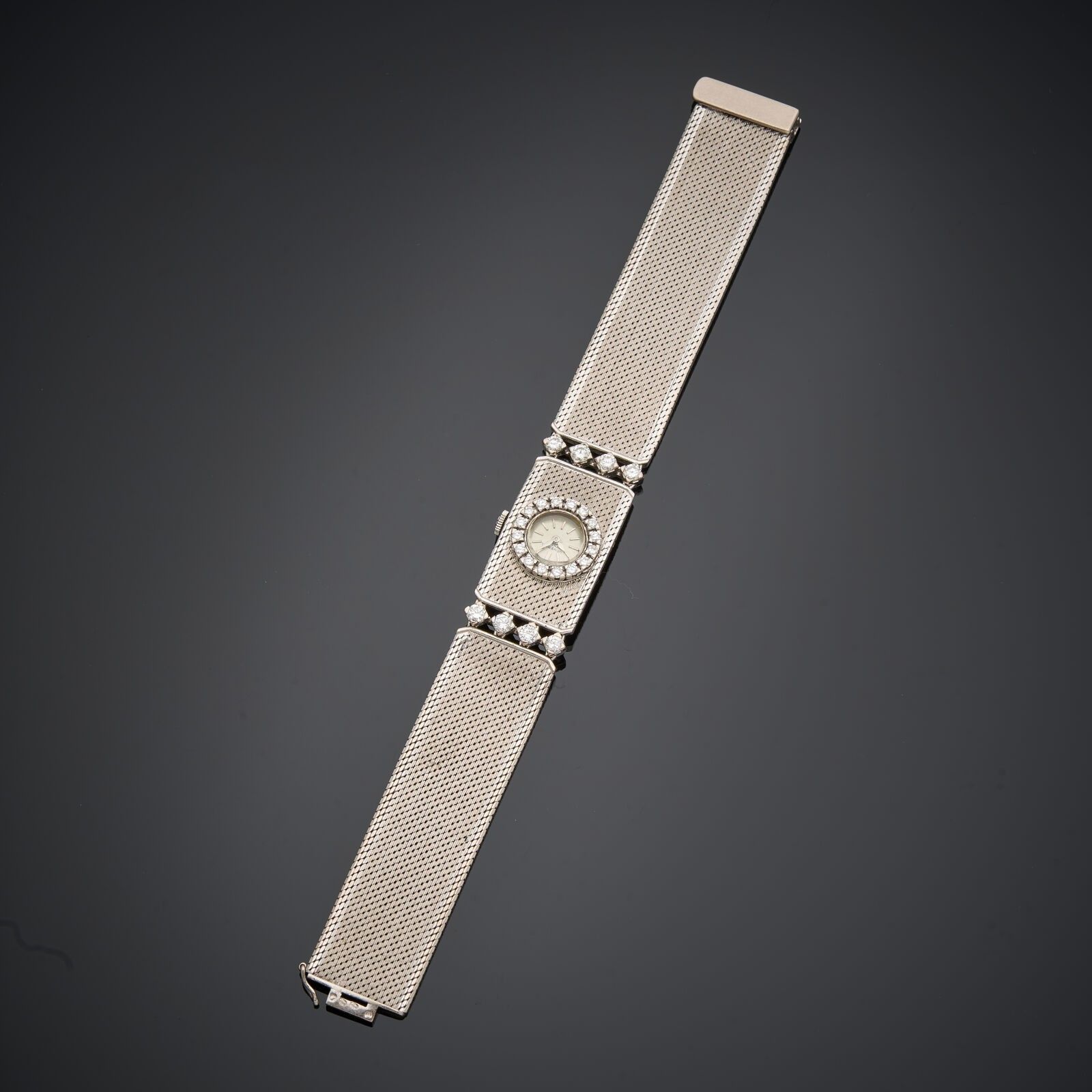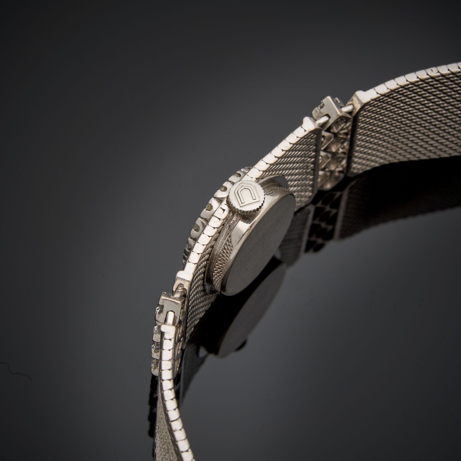 UNIVERSAL Genève - Ladies' wristwatch in 18 k (750 thousandths) white gold, round dial surrounded by diamonds, two openwork sections each set with four diamonds. Articulated white gold bracelet.