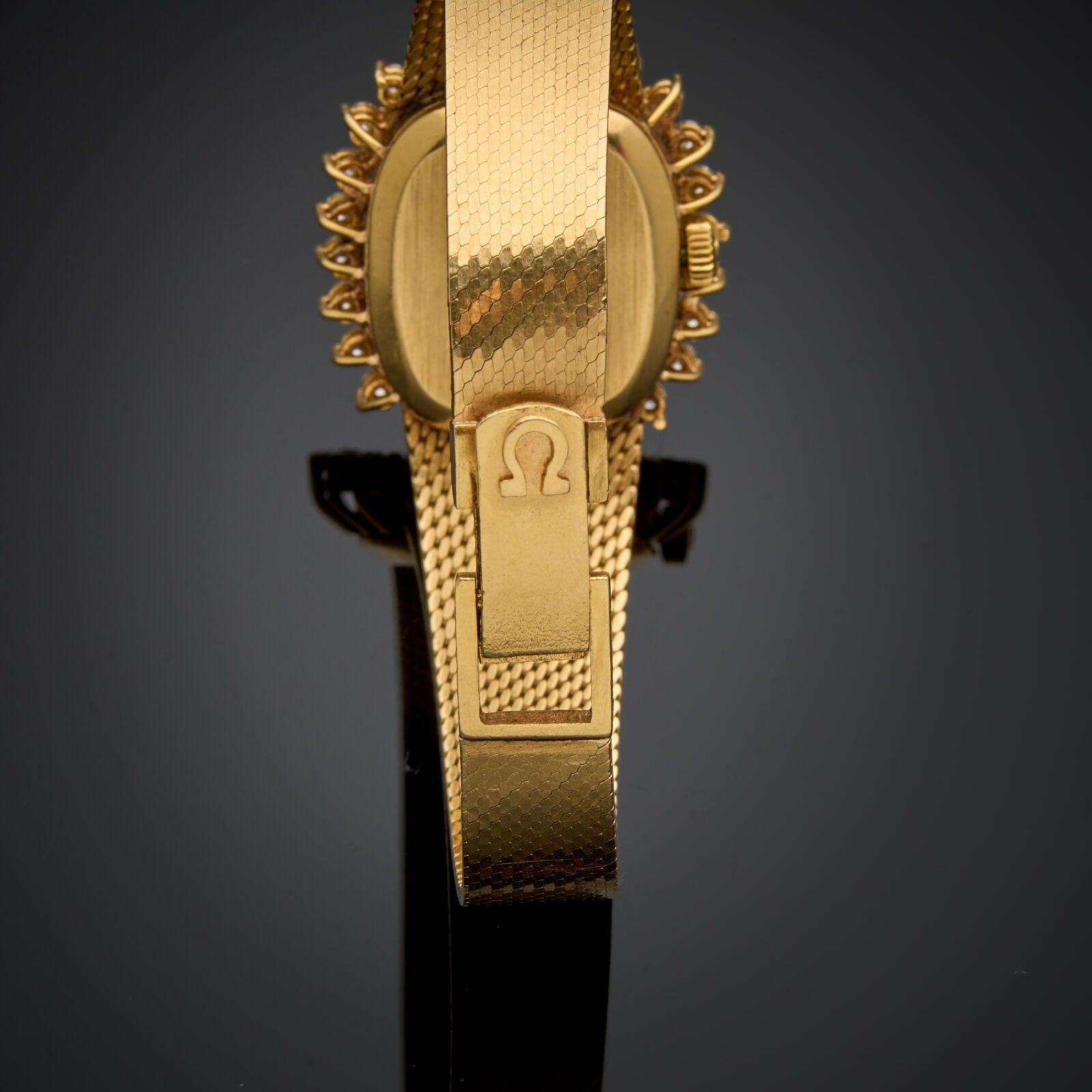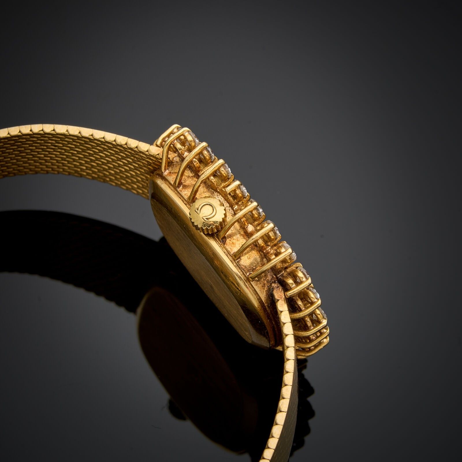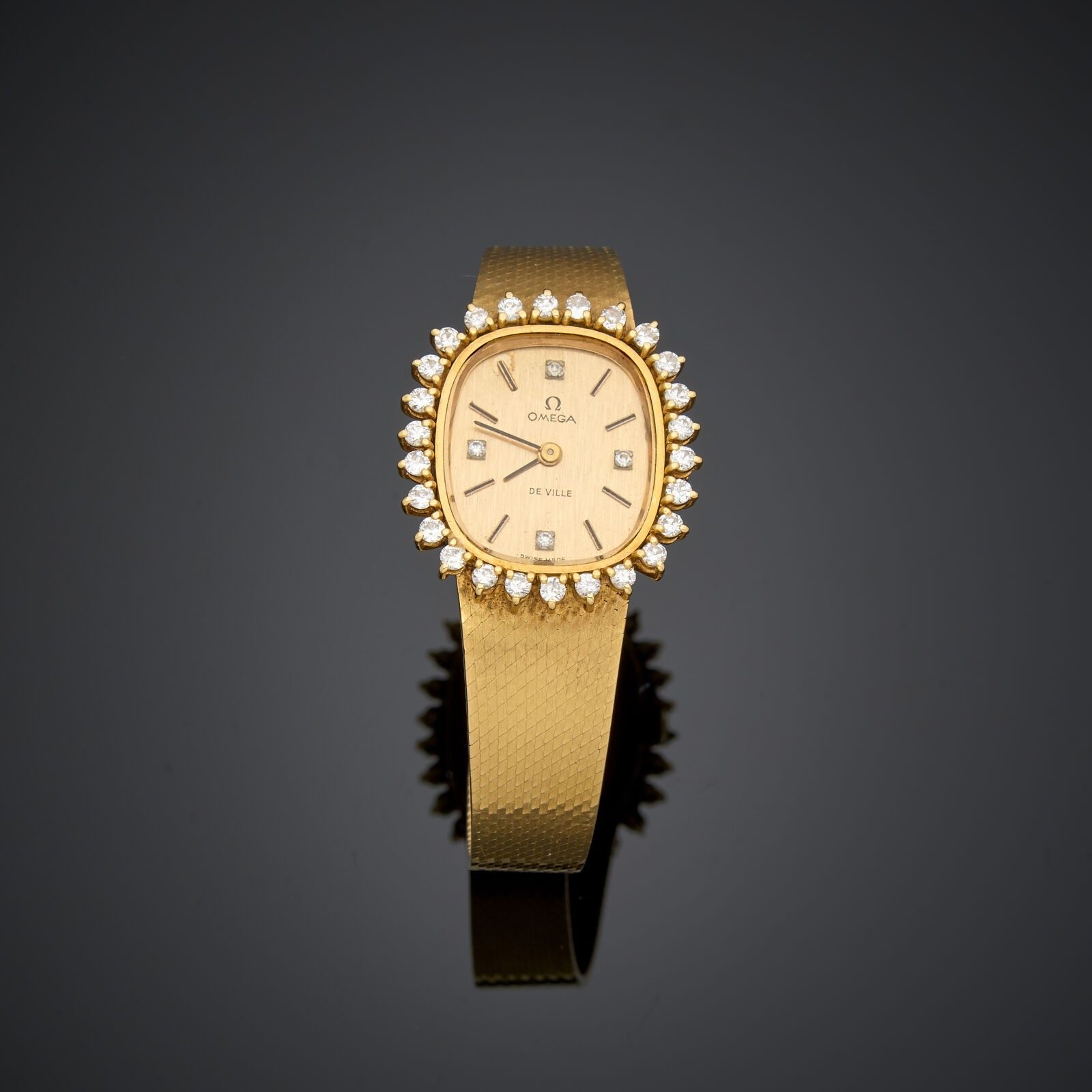 OMEGA - Ladies' watch, DE VILLE model, 18k (750 thousandths) yellow gold, oval dial with gilded background adorned with 4 diamonds, surrounded by diamonds, articulated bracelet in 18k (750 thousandths) yellow gold.