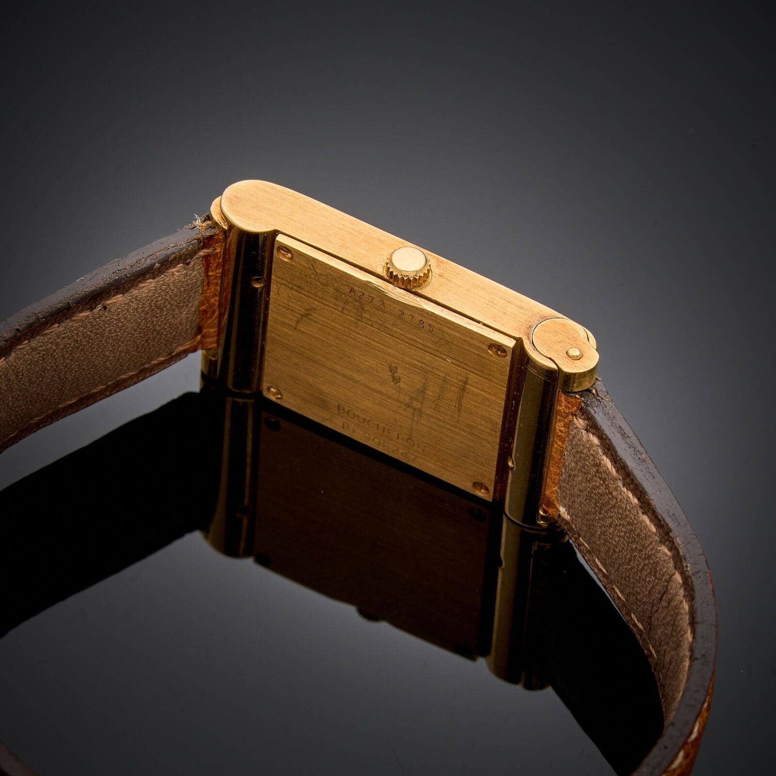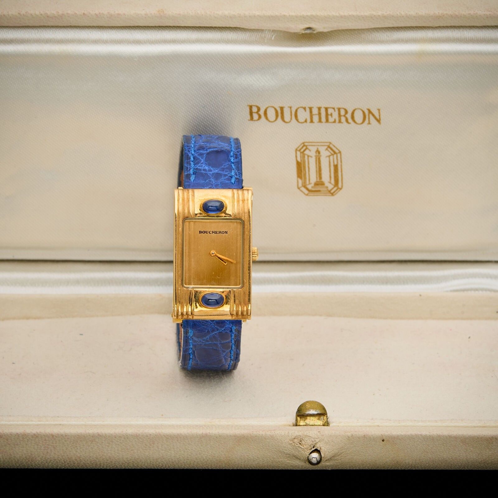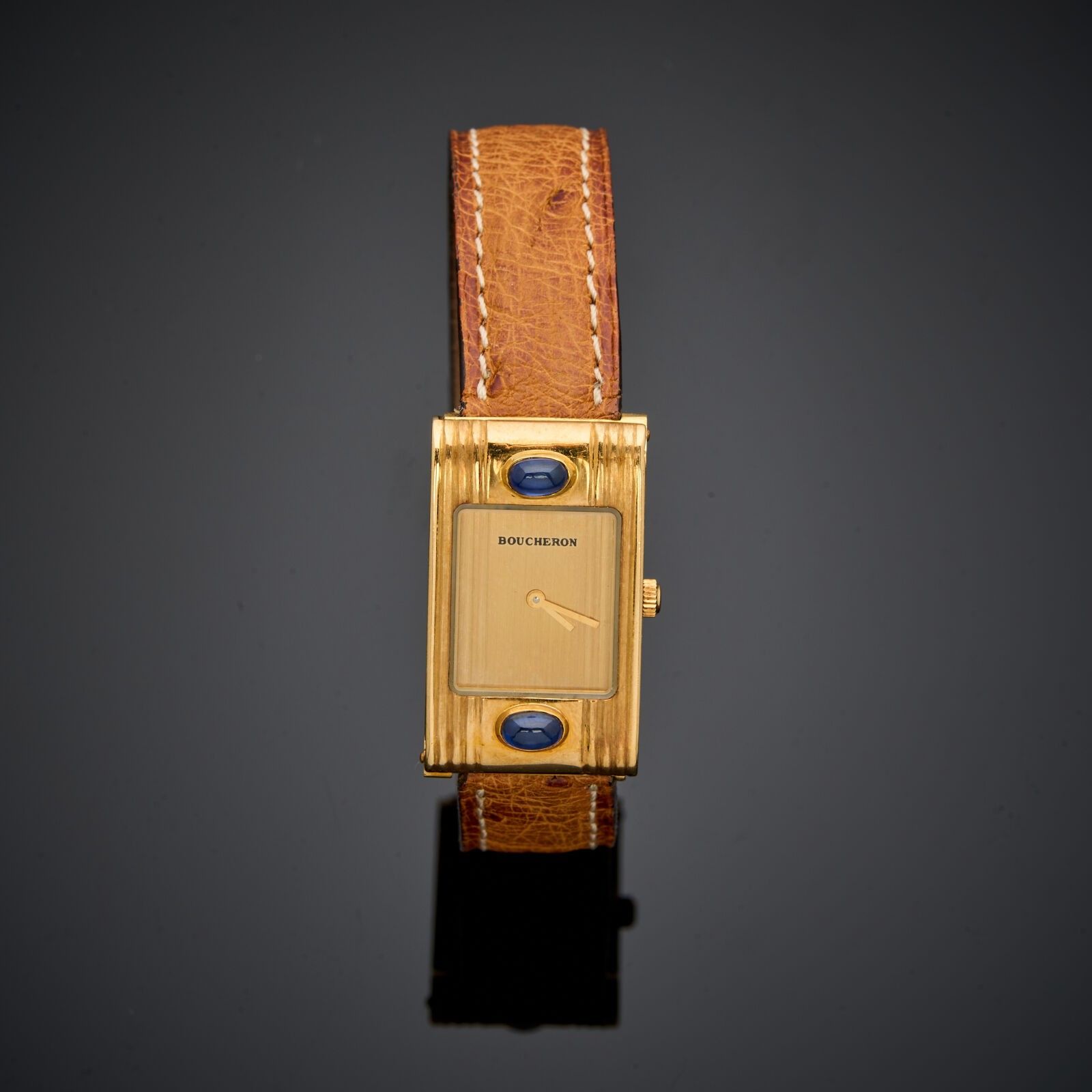 BOUCHERON - REFLET LADY ladies' watch in 18 k (750 thousandths) yellow gold, fluted rectangular dial, adorned with two sapphire cabochons, signed and numbered BT 908247. Quartz movement. Two interchangeable blue and brown leather straps signed Boucheron. Beige leather Boucheron case (small tear in the case).