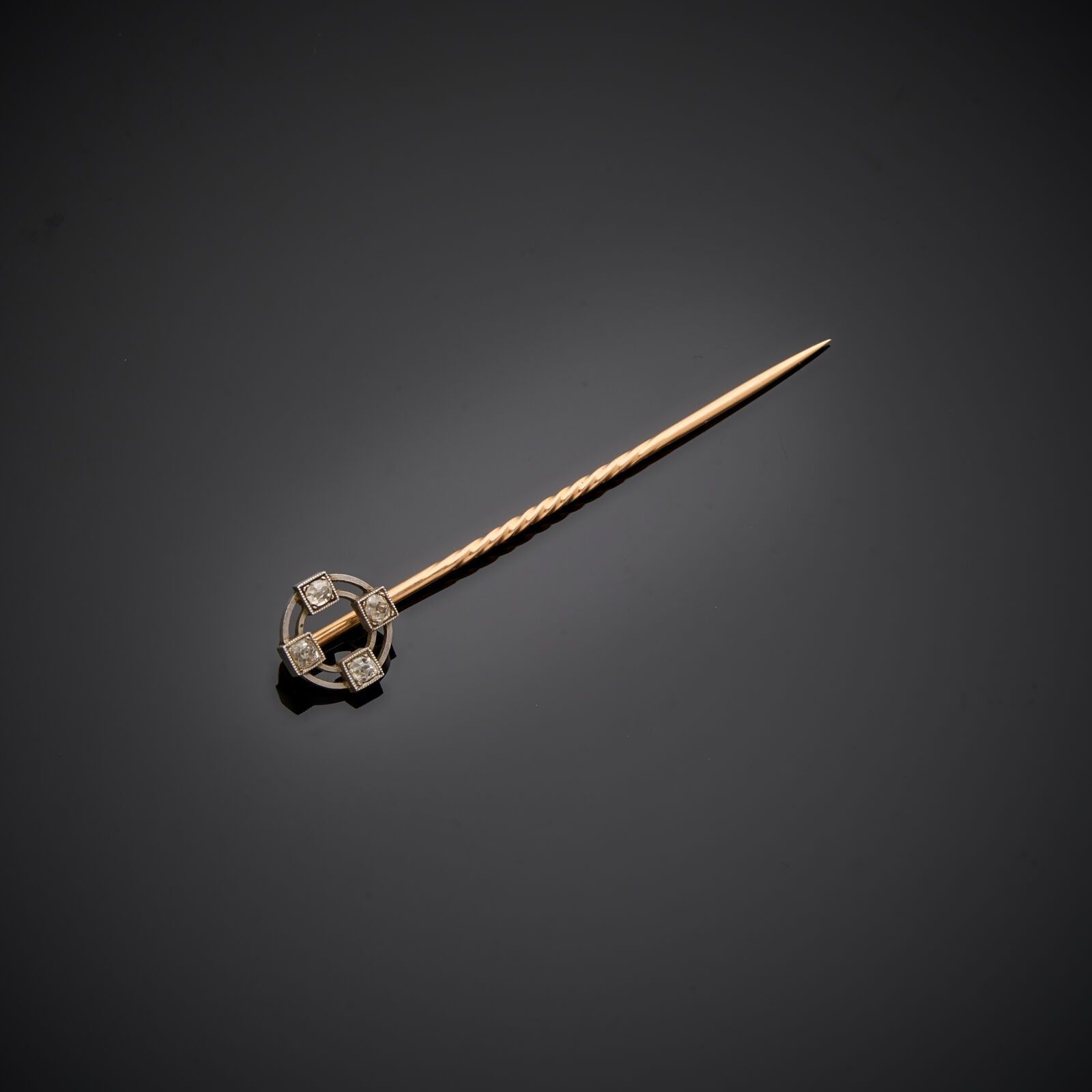 18k (750 thousandths) yellow gold and platinum tie pin, the upper round part set with four 8/8-cut diamonds.