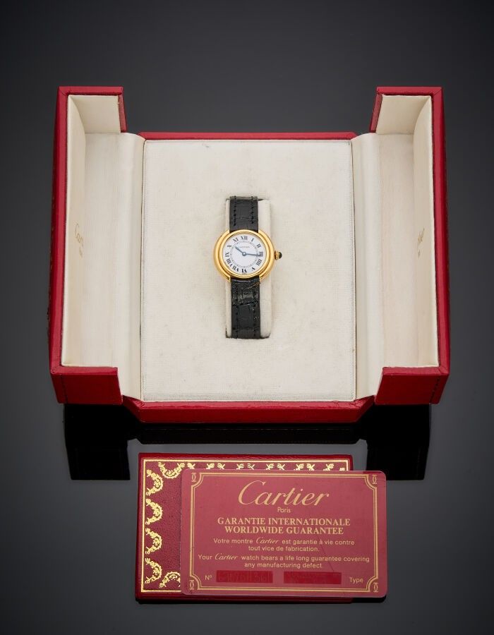 CARTIER - Vendôme ladies' wristwatch in 18k (750 thousandths) yellow gold, round case, double flanges on the bezel, white enamelled dial with Roman numerals and track minute track in the centre, signed, hand-wound mechanical movement. Original Cartier 18k (750 thousandths) yellow gold folding clasp. Black leather strap.