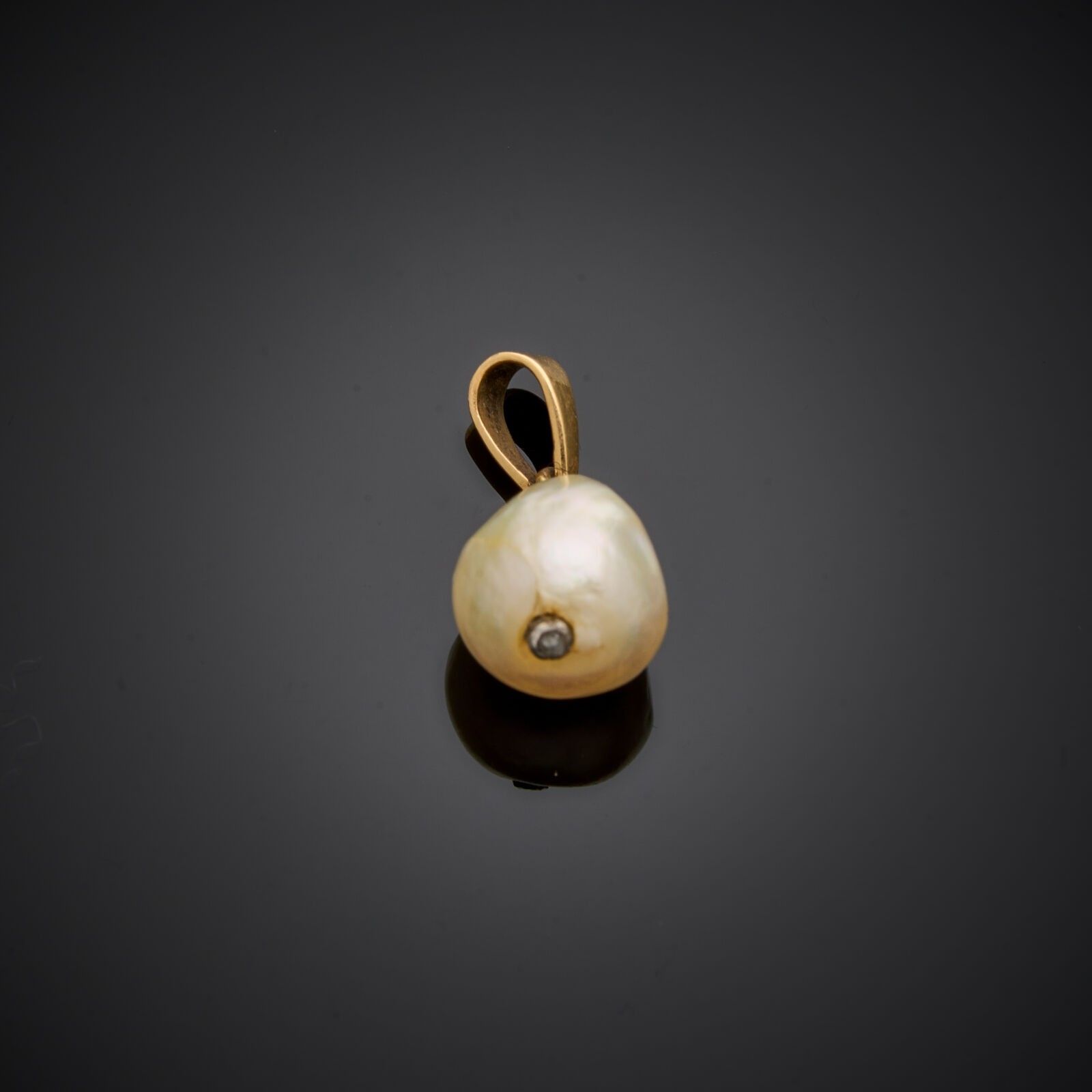 18 k (750 thousandths) yellow gold pendant set with a probably fine baroque pearl, the end set with a small rose-cut diamond.
