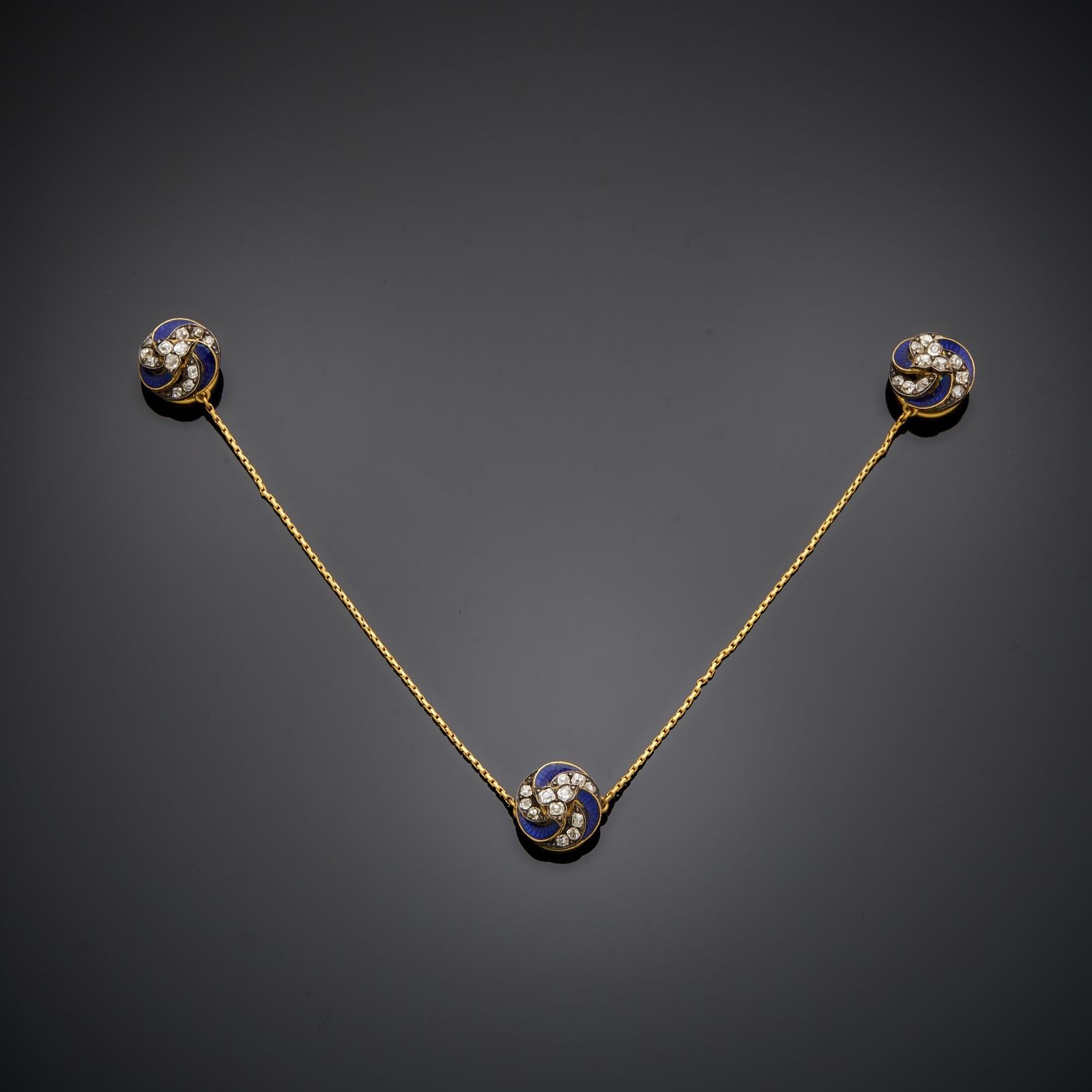 Three 18 k (750 thousandths) yellow gold buttons in the form of spirals set with old-cut diamonds and blue enamel, held by a gold chain.