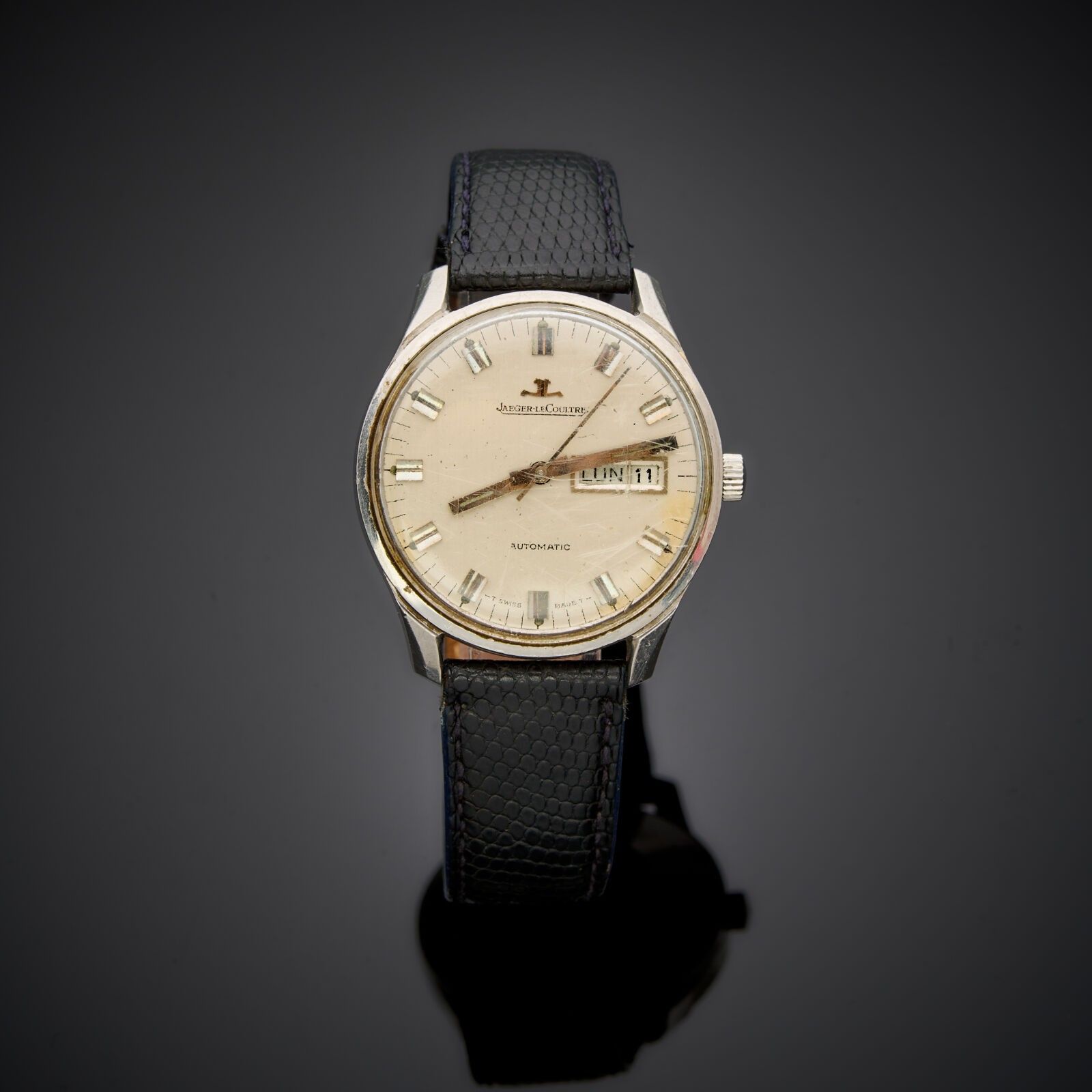 JAEGER LECOULTRE - Automatic steel watch, round silvered dial, date windows and days of the week at 3 o'clock. Black leather strap with pin buckle.