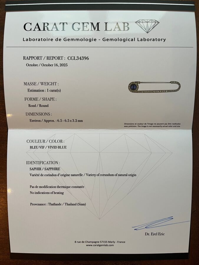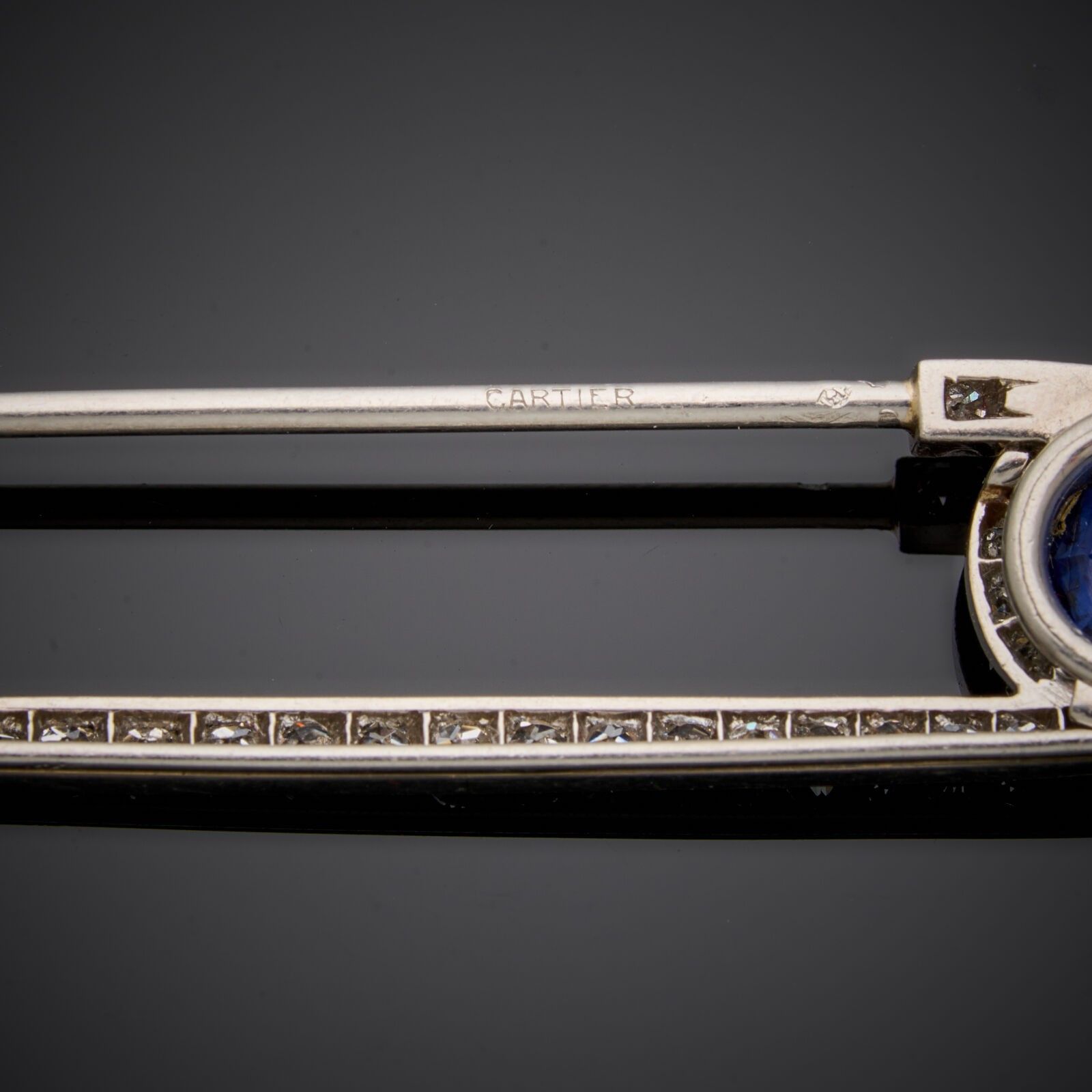CARTIER circa 1920 - 18k (750 thousandths) white gold pin set with diamonds and adorned with a sapphire.