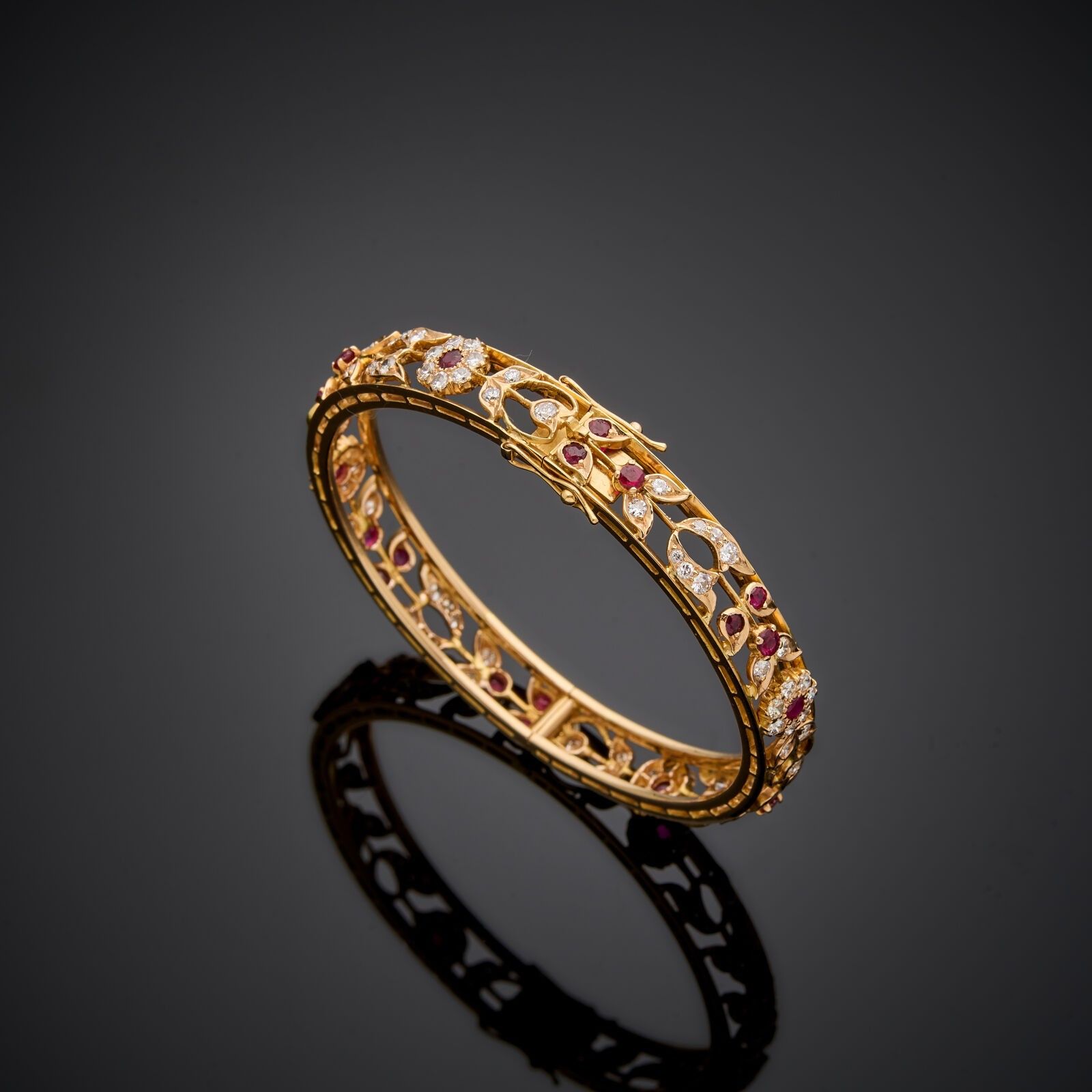 Bracelet in 18 k yellow gold (750 thousandths) decorated with openwork foliage scrolls set with diamonds and red stones. Two safety eights.