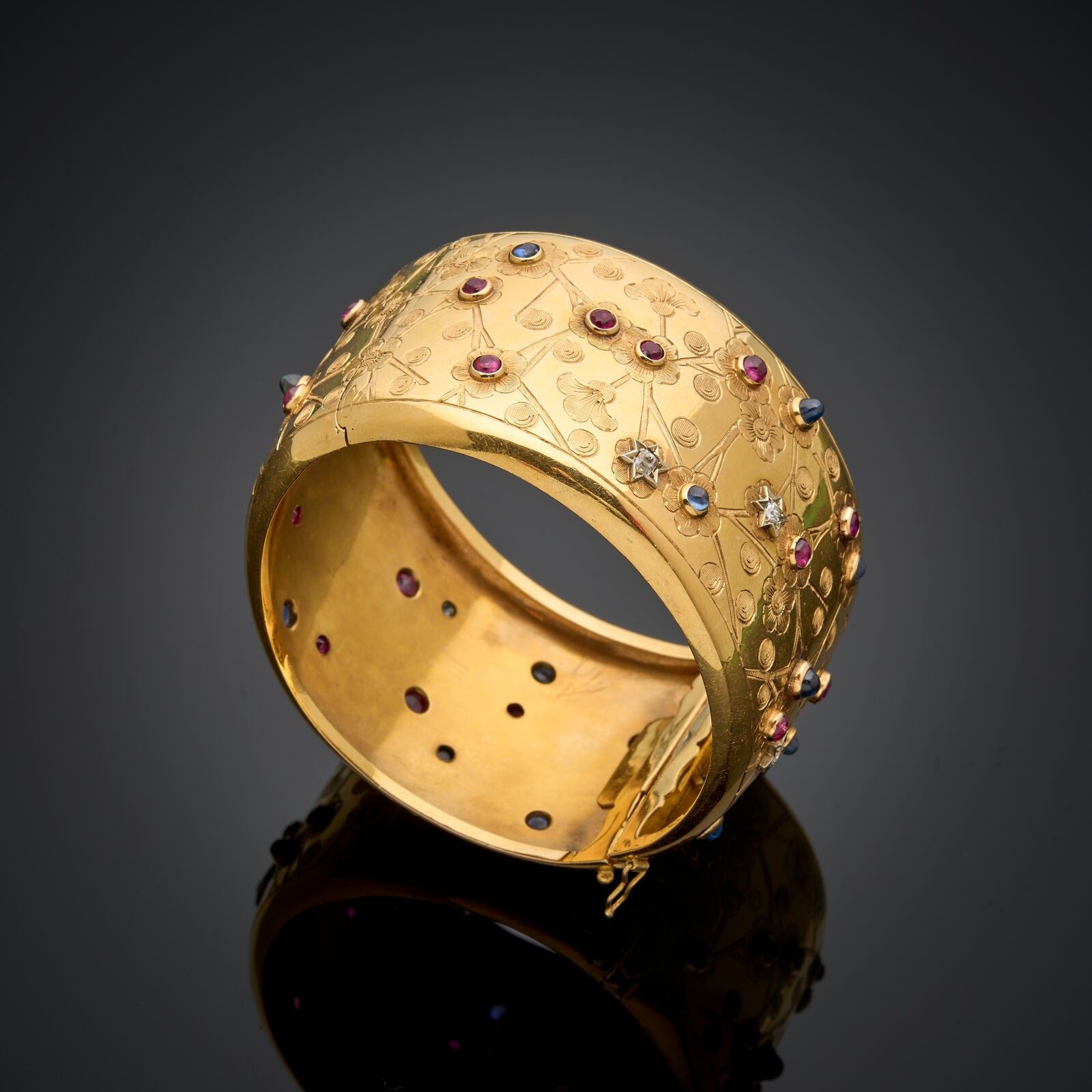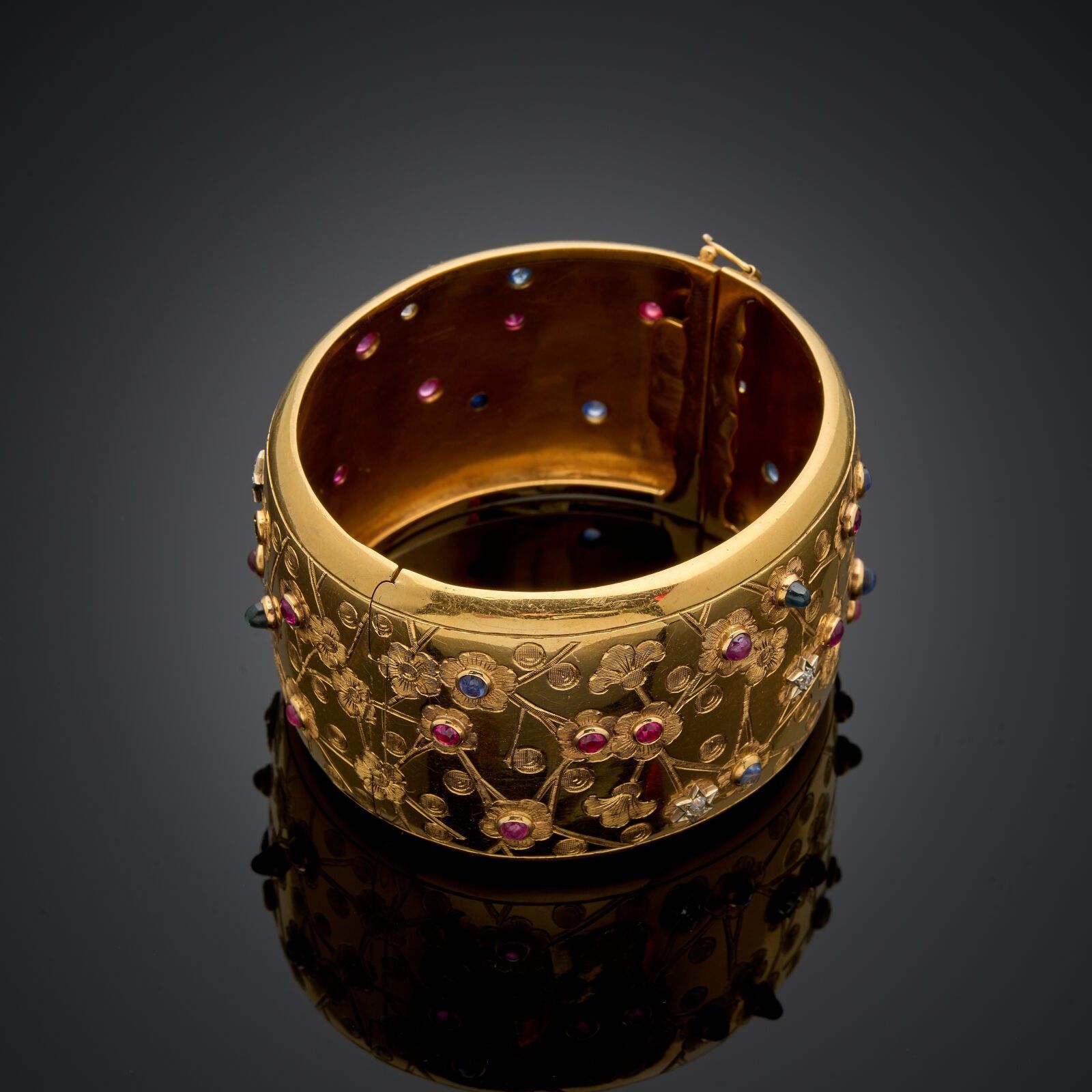 Rigid bracelet in 18 k yellow gold (750 thousandths) with engraved cherry tree branches set with old-cut diamonds, rubies, sapphires and coloured stones. Two safety eights (restoration, small dents to clasp).