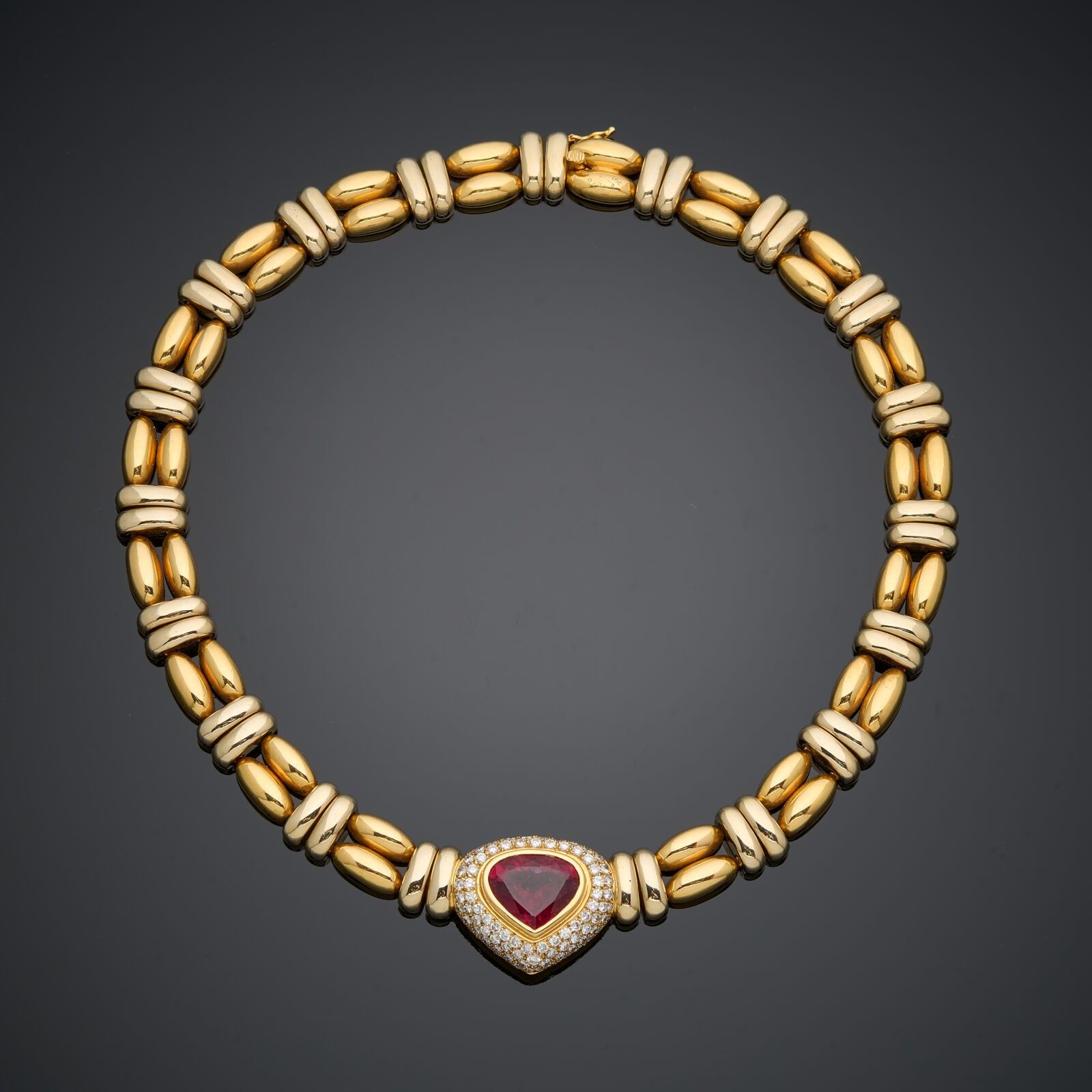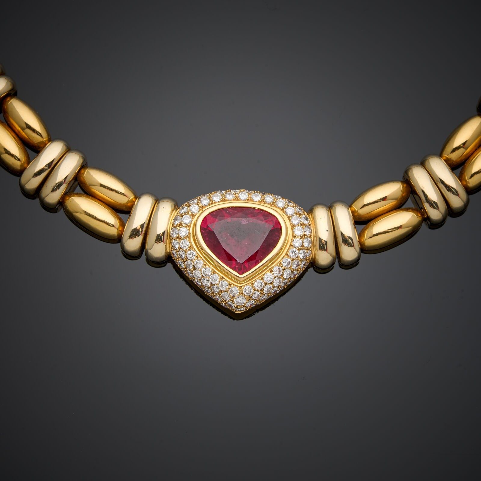 POIRAY - Two-tone articulated necklace in 18k (750 thousandths) yellow gold with alternating navettes, centred on a large heart set with a large heart-cut rubelite weighing approximately 25 carats in a diamond-paved setting.