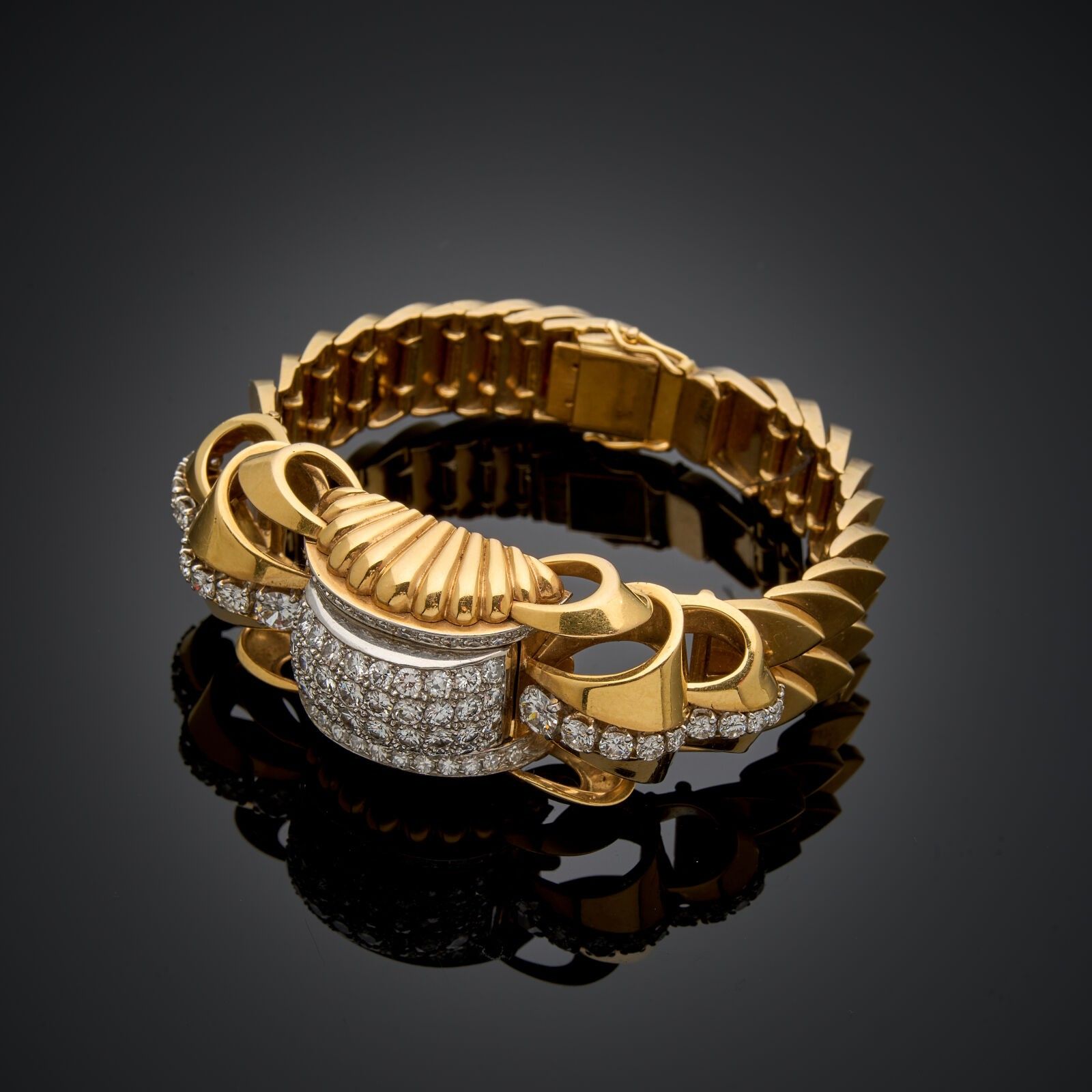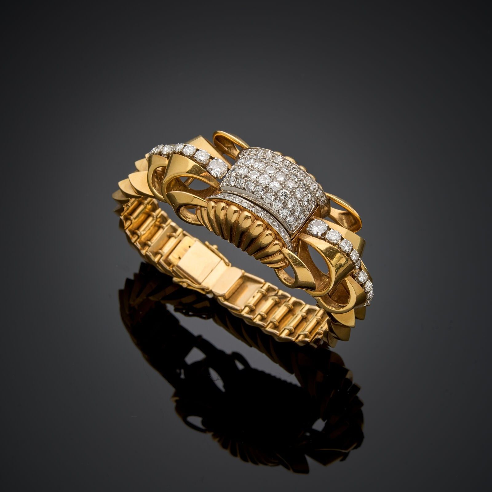 Watchband in 18 k yellow gold (750 thousandths) set with diamonds (86 diamonds, two of which are larger). Two safety clasps.