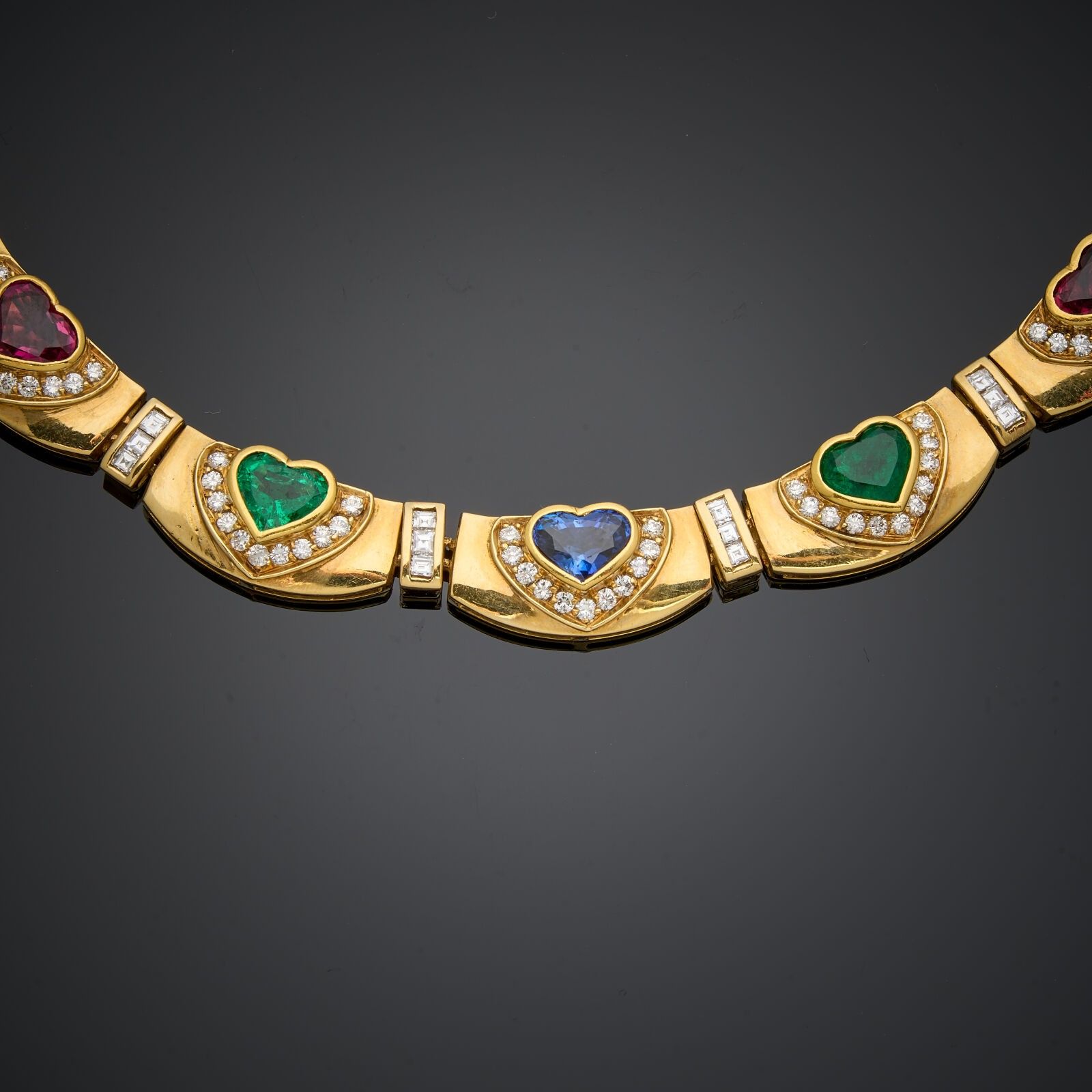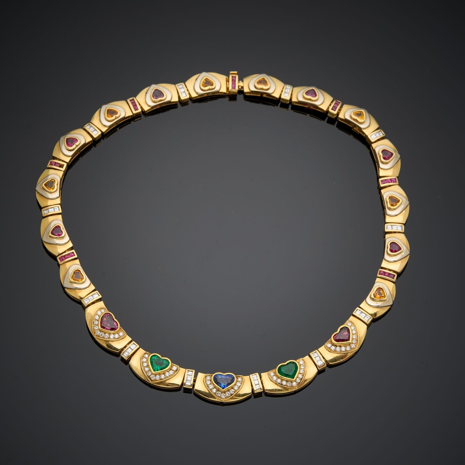 Articulated necklace in 18k (750 thousandths) yellow gold set with heart-cut emeralds, sapphires, rubies and yellow sapphires, some set in diamonds and alternating with calibrated rubies and square diamonds.