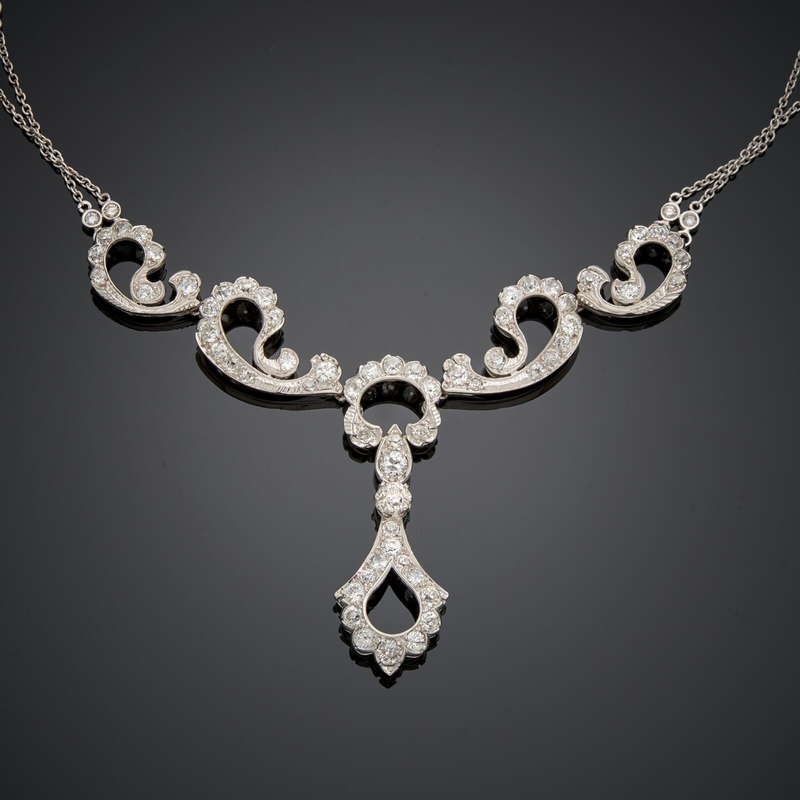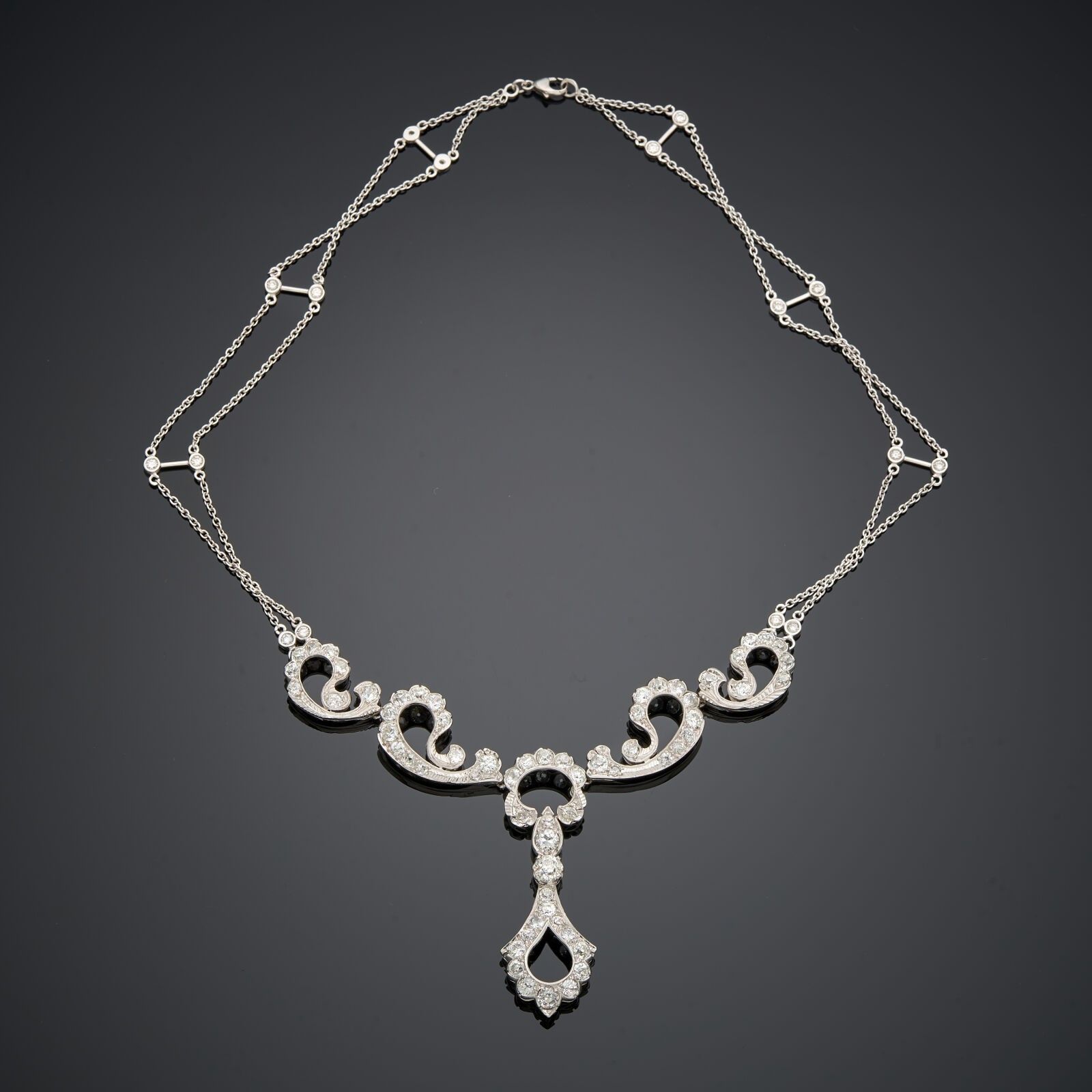 18 k (750 thousandths) white gold drapery necklace set with a large scrolling and volute motif set with old-cut diamonds, the double chain alternating with diamond-set bars (total of 78 diamonds)