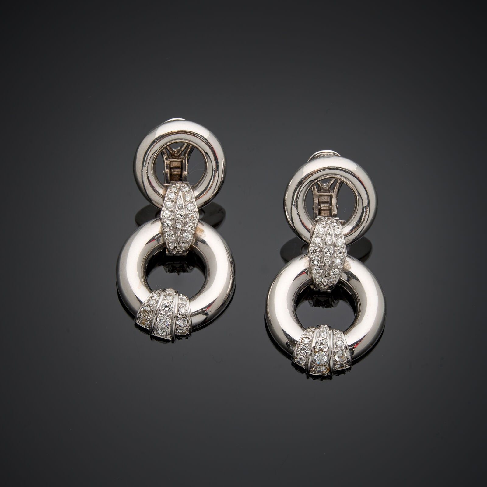 Pair of clip earrings in 18k (750 thousandths) white gold in the form of double rings set with diamonds on the clasps.