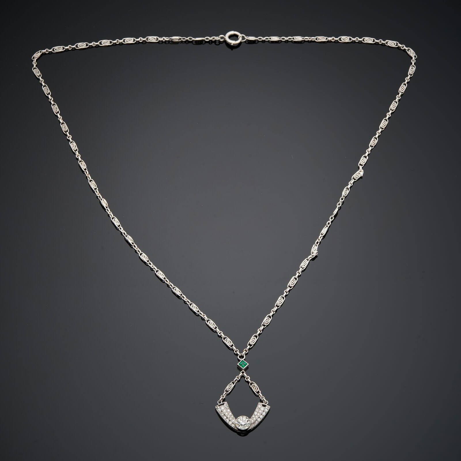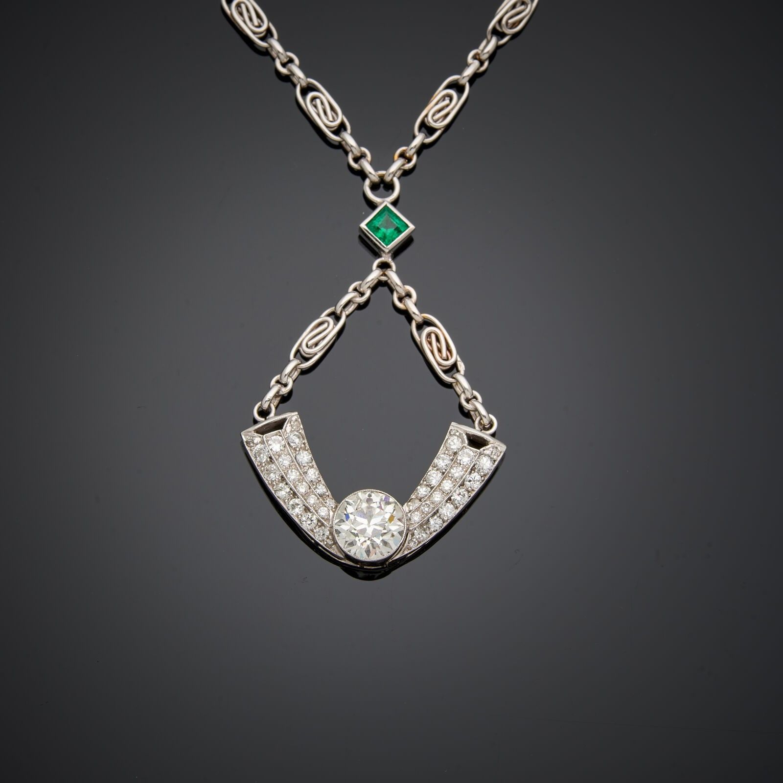 18 k (750 thousandths) white gold necklace comprising a chain ending in a pendant set with an old-cut diamond weighing approximately 2 carats in a diamond-paved setting and adorned with a square emerald.