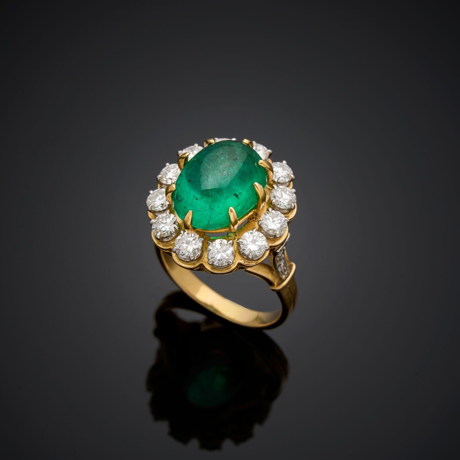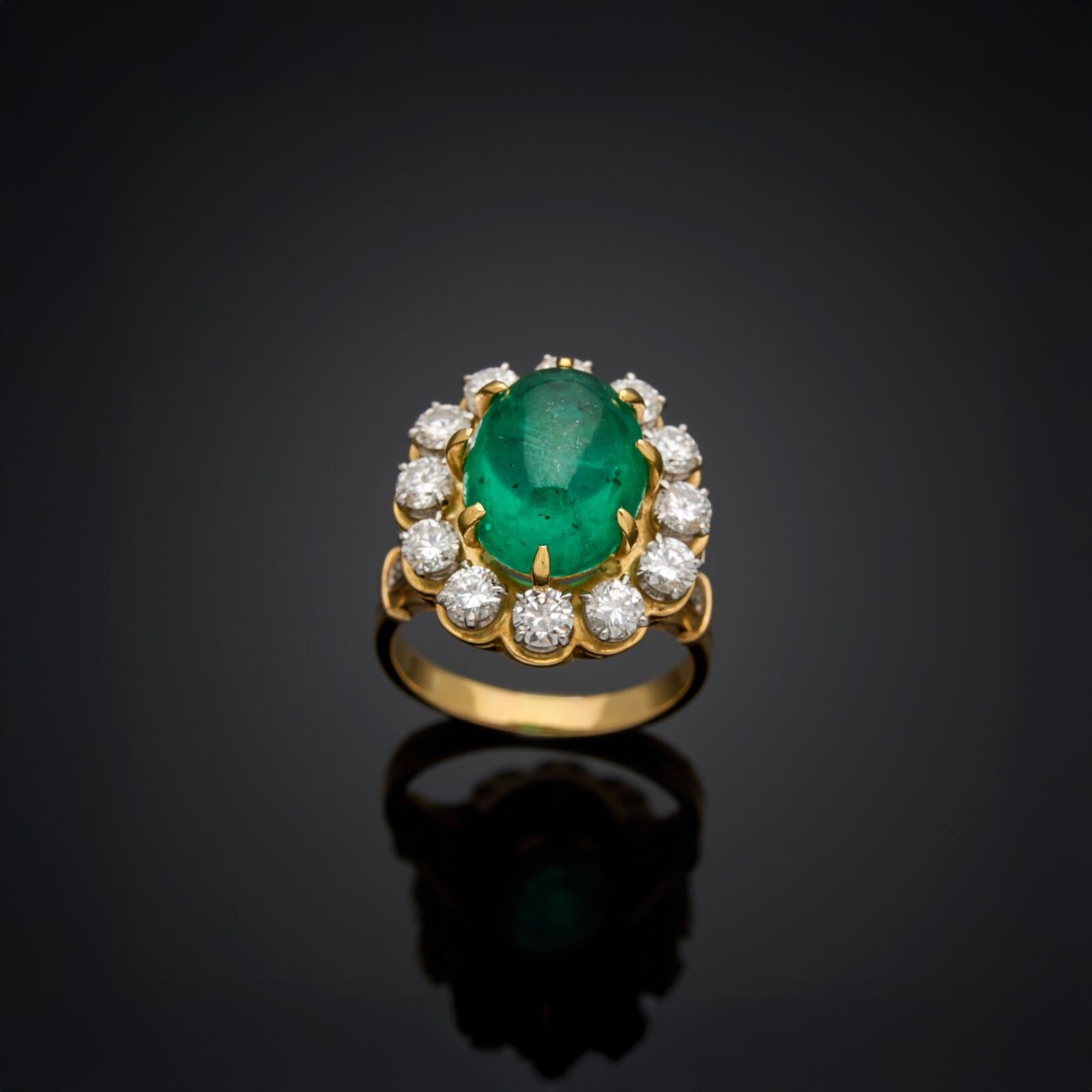 18 k (750 thousandths) yellow gold ring set with a 7.64 carat emerald cabochon surrounded by 12 modern-cut diamonds. (10 x 0.2 carats: approximately 2 carats of diamonds)