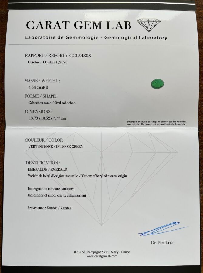 CGL certificate dated 1 October 2025 N° CGL34308 indicating emerald 7.64 carats, intense green, Colombia, minor impregnation noted.
