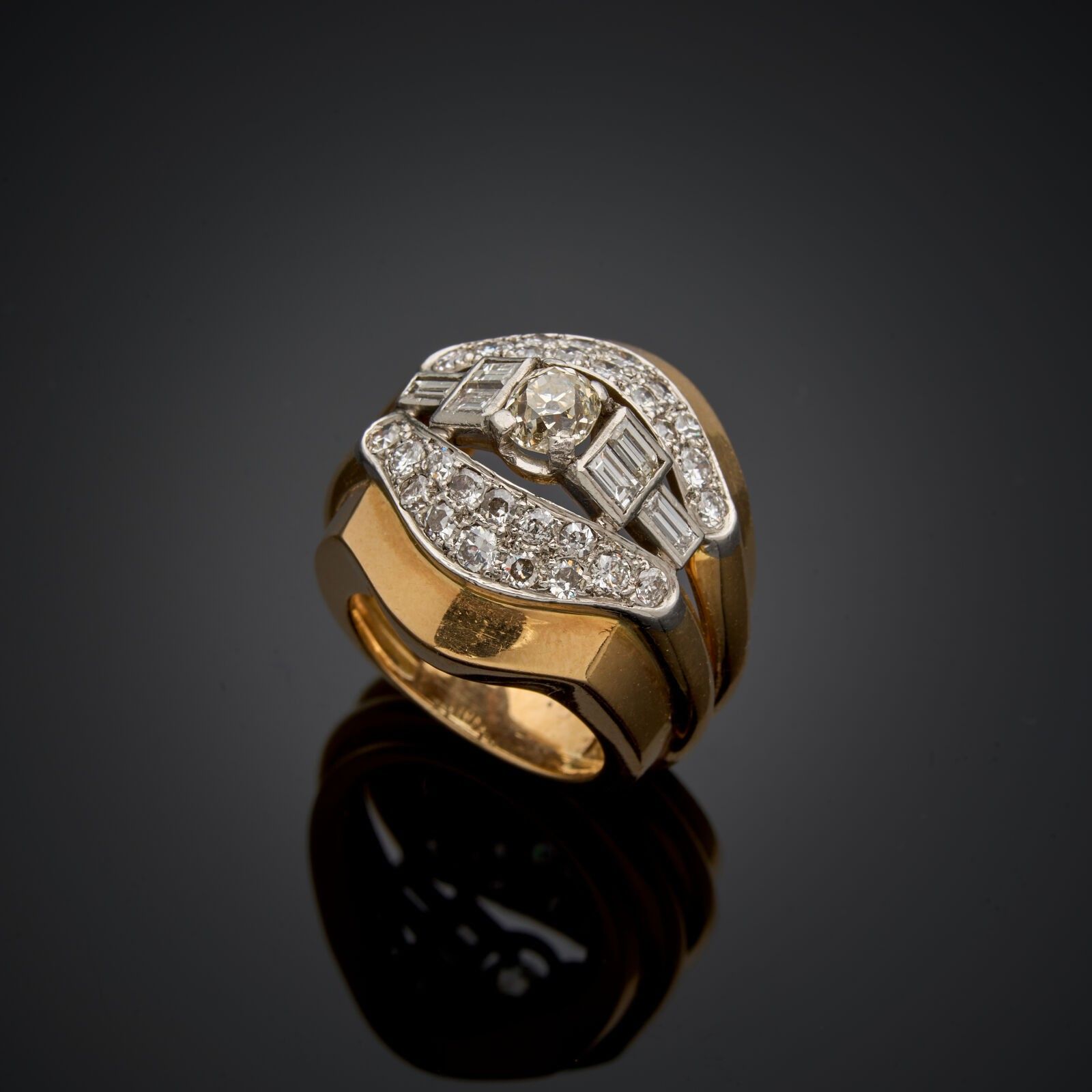 18 k (750 thousandths) yellow gold and platinum ring set with brilliant-cut and baguette-cut diamonds and a larger old-cut diamond weighing approximately 0.5 carats.