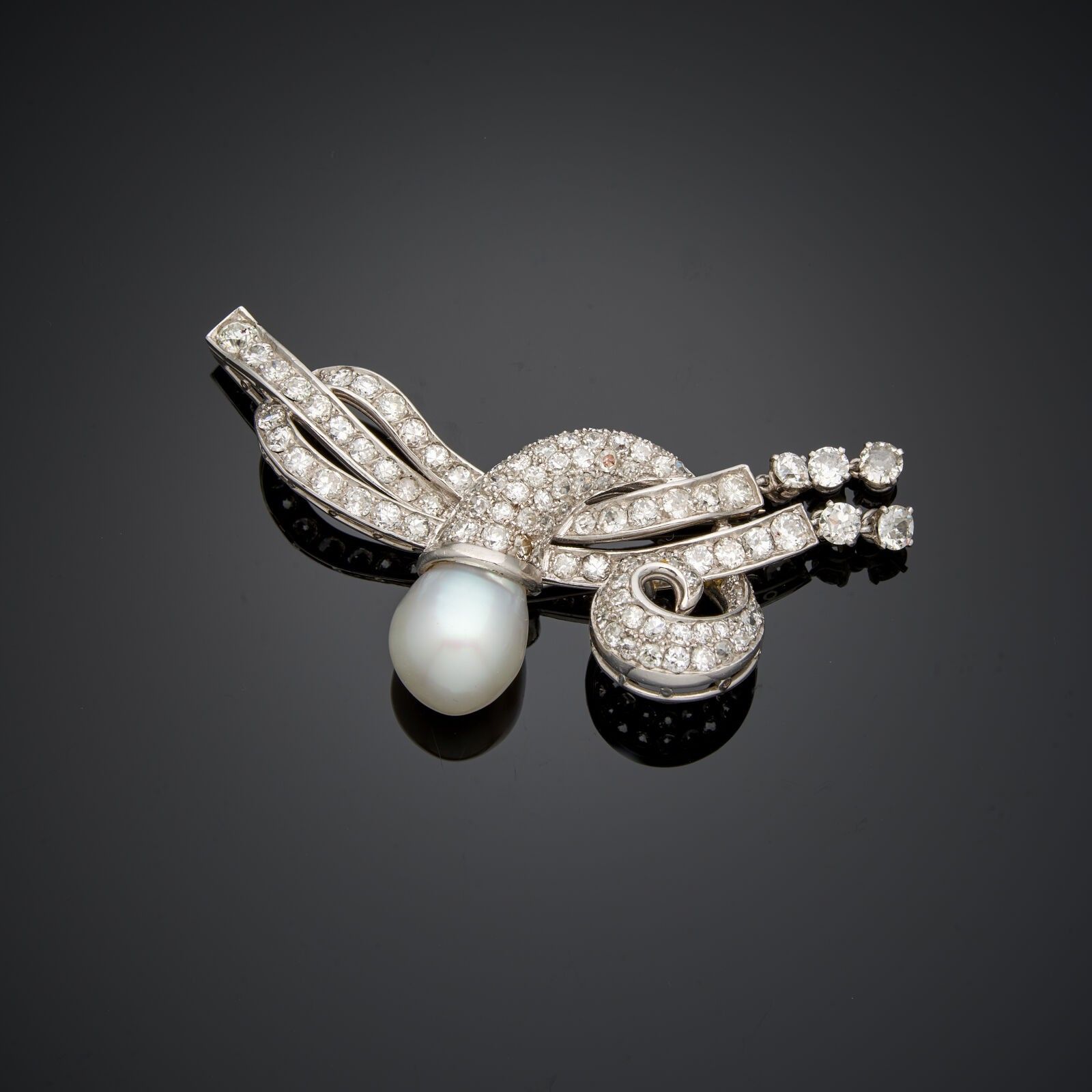 18 k (750 thousandths) white gold brooch in the shape of a cornucopia, ribbons and pendants, set with diamonds and probably a cultured pearl (Height of the pearl 14 mm - 105 old and modern-cut diamonds)