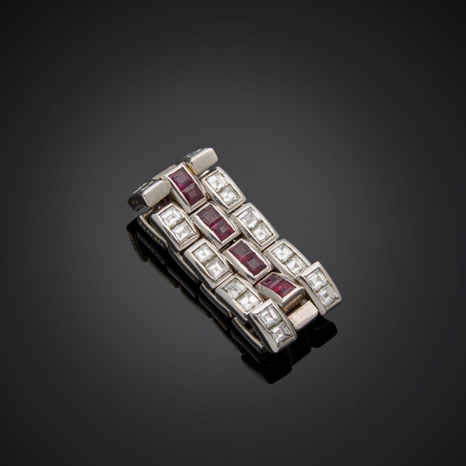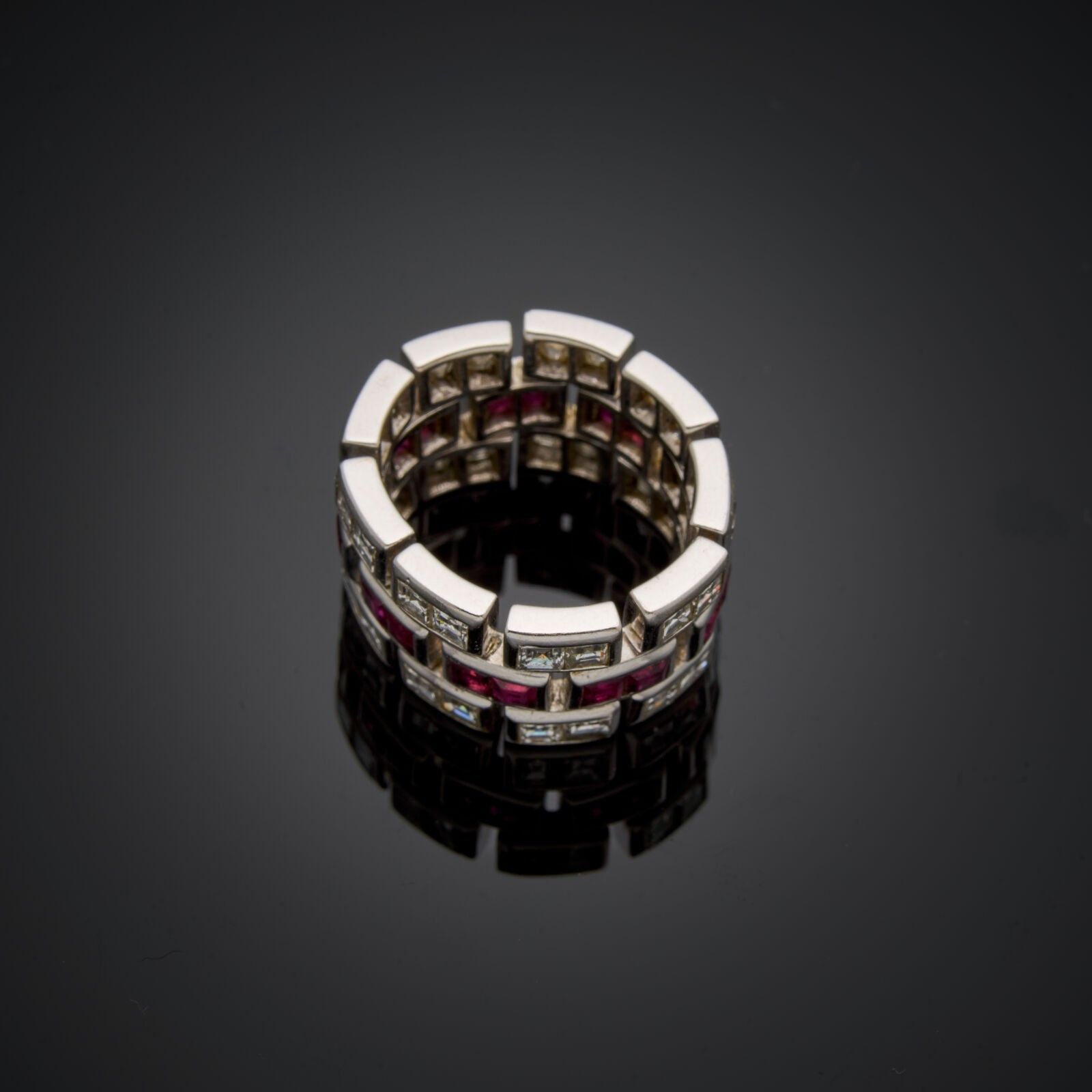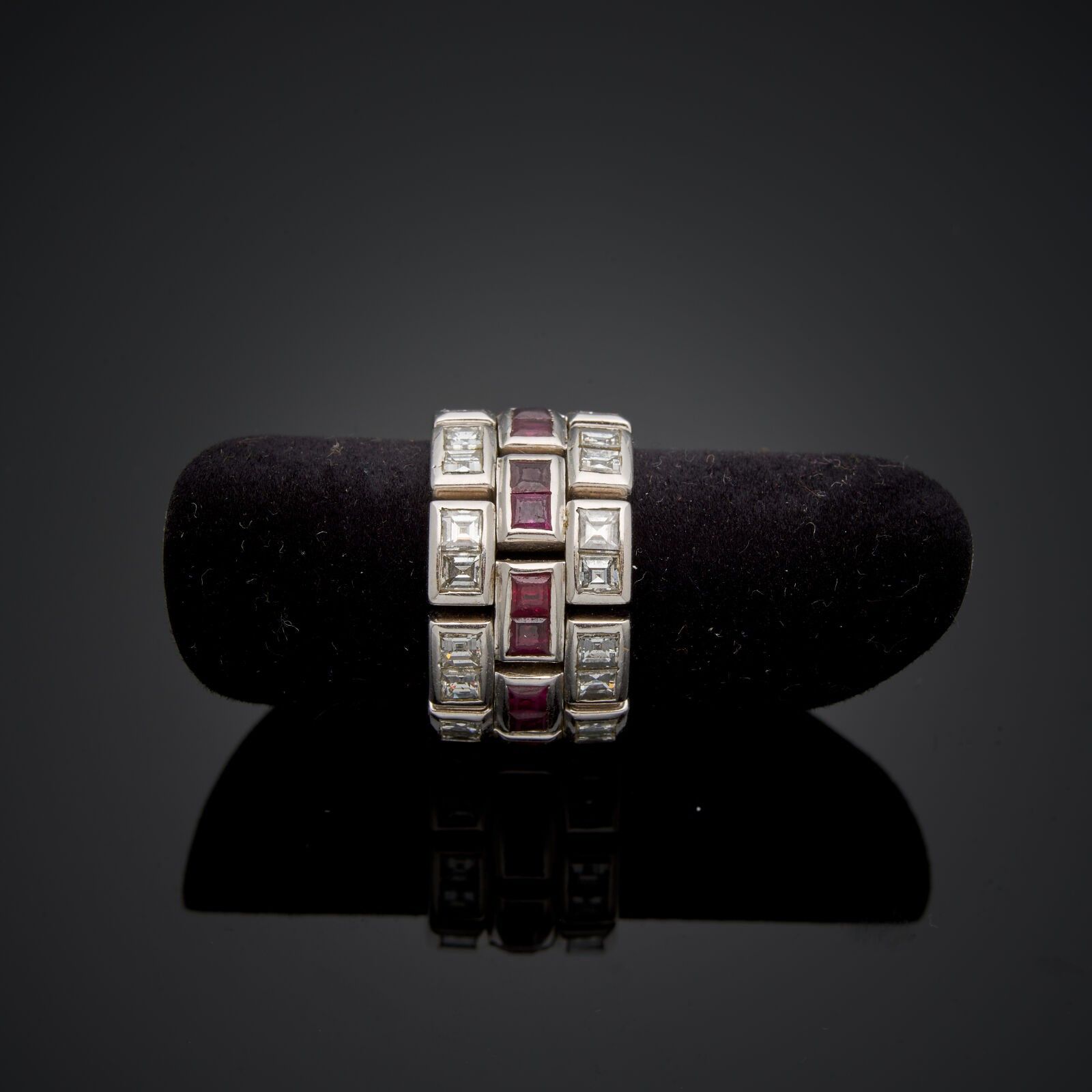 FARAONE - Articulated wedding ring in 18 k (750 thousandths) white gold set with three alternating lines of calibrated rubies and princess-cut diamonds (36 diamonds - 18 rubies).