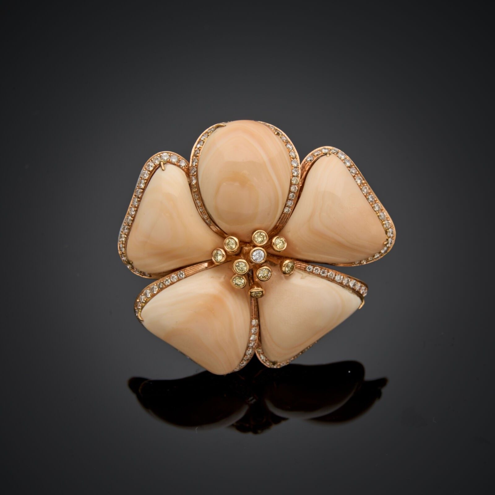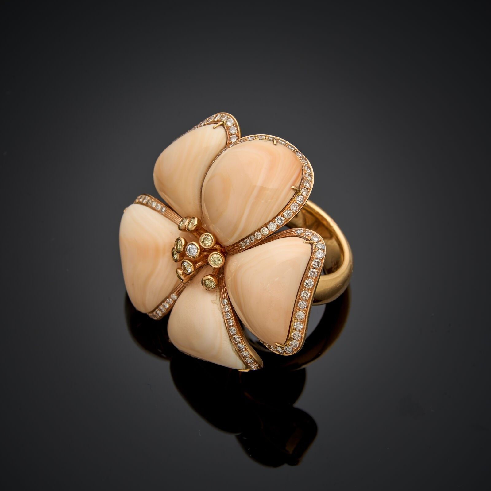 Large 18 k (750 thousandths) yellow gold flower ring set with coral cabochons surrounded by diamonds, the stamens in the centre set with diamonds.