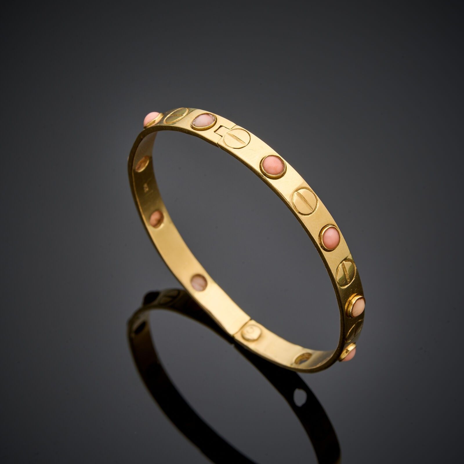 LOVE" rigid bracelet in 18 k (750 thousandths) yellow gold alternating with pink coral cabochons (one coral cabochon missing).