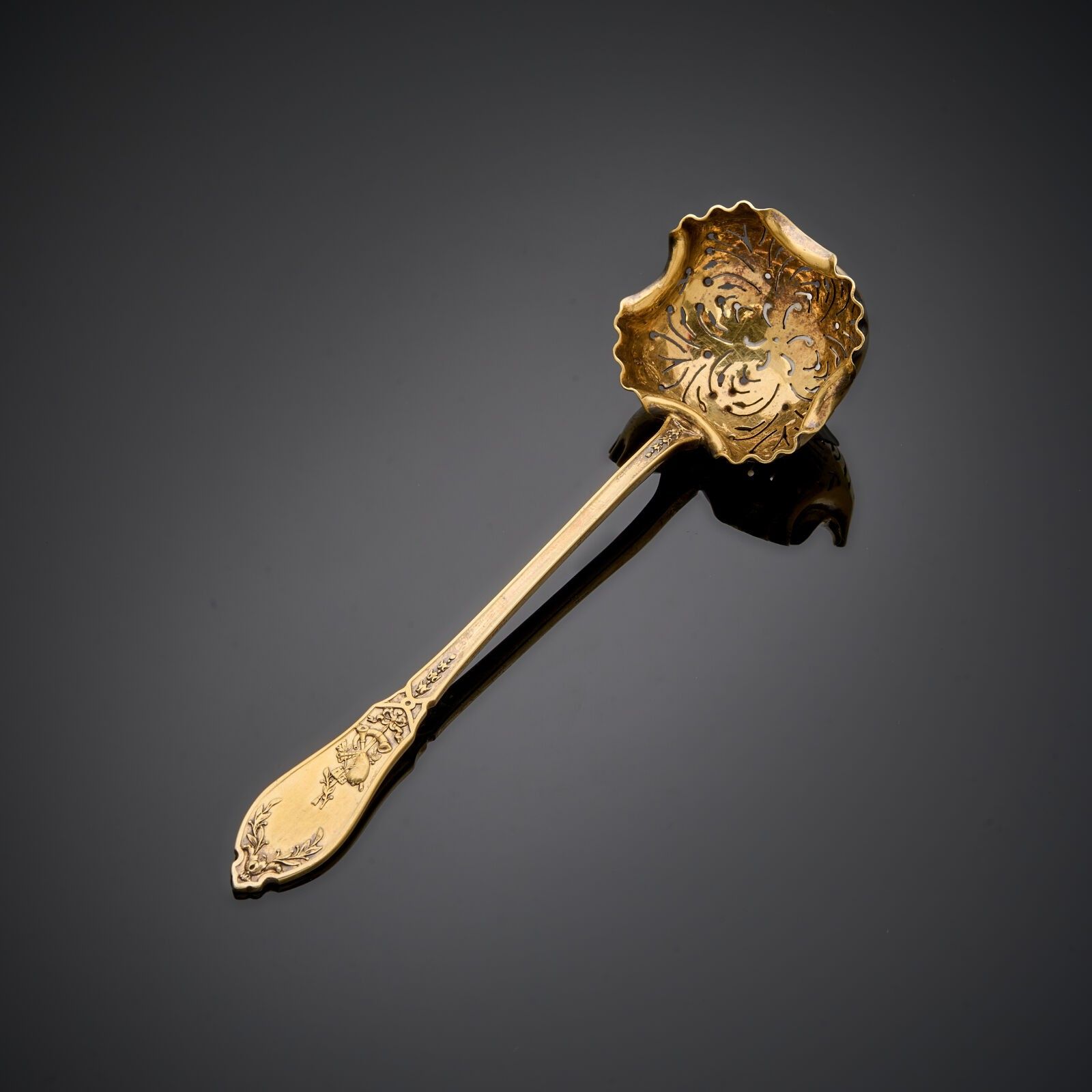 Belle Epoque" tea strainer with foliage and flowers. Beautiful vermeil colour, by Antoine Lappara, active between 1895-1902
