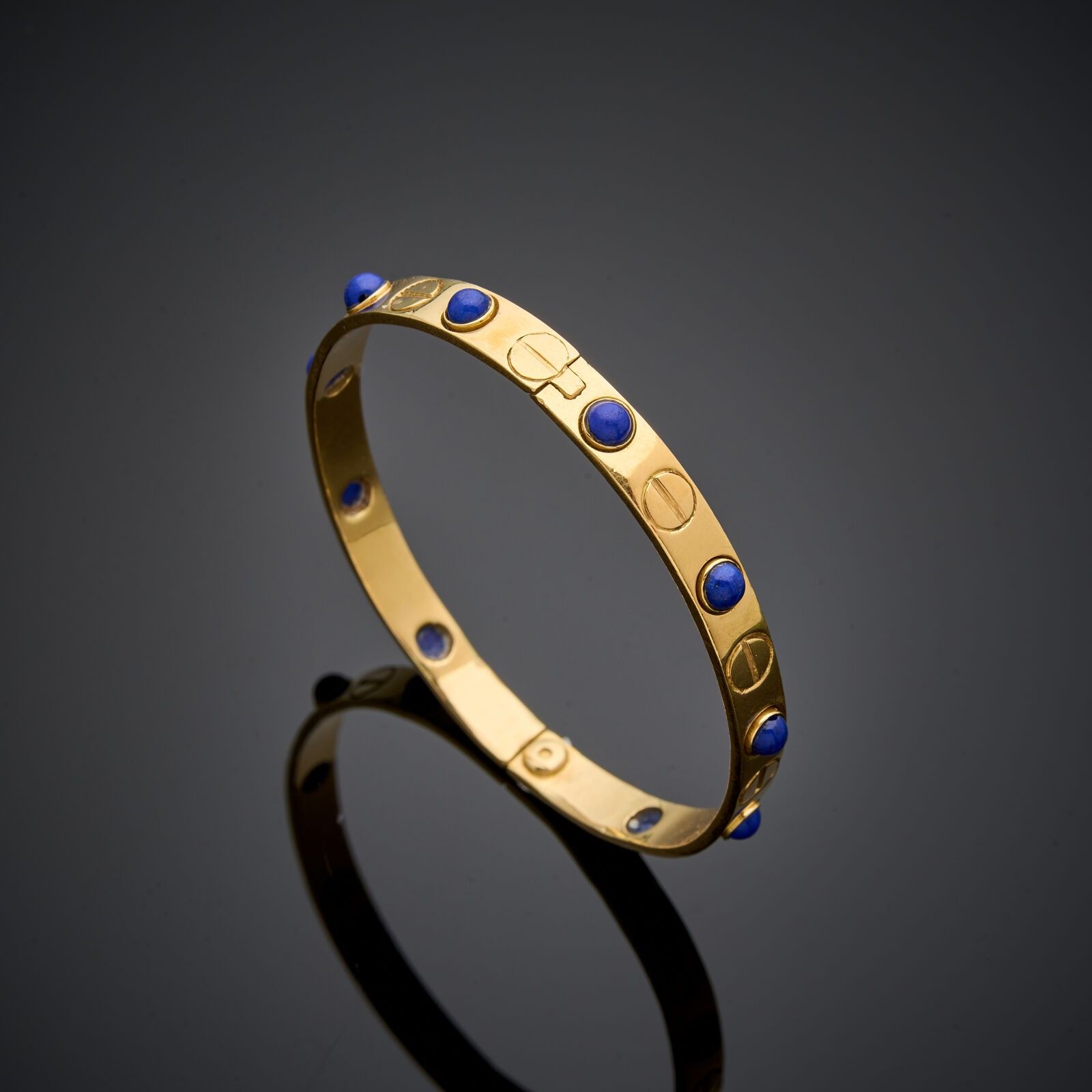 LOVE" rigid bracelet in 18 k (750 thousandths) yellow gold alternating with lapis lazulis cabochons.