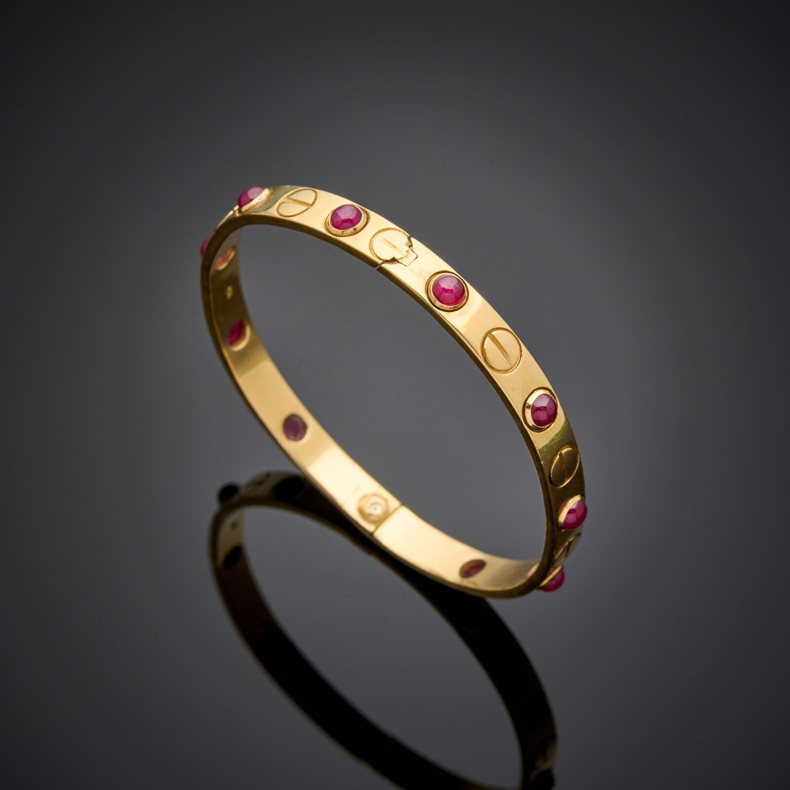 LOVE" rigid bracelet in 18 k (750 thousandths) yellow gold alternating with ruby cabochons.