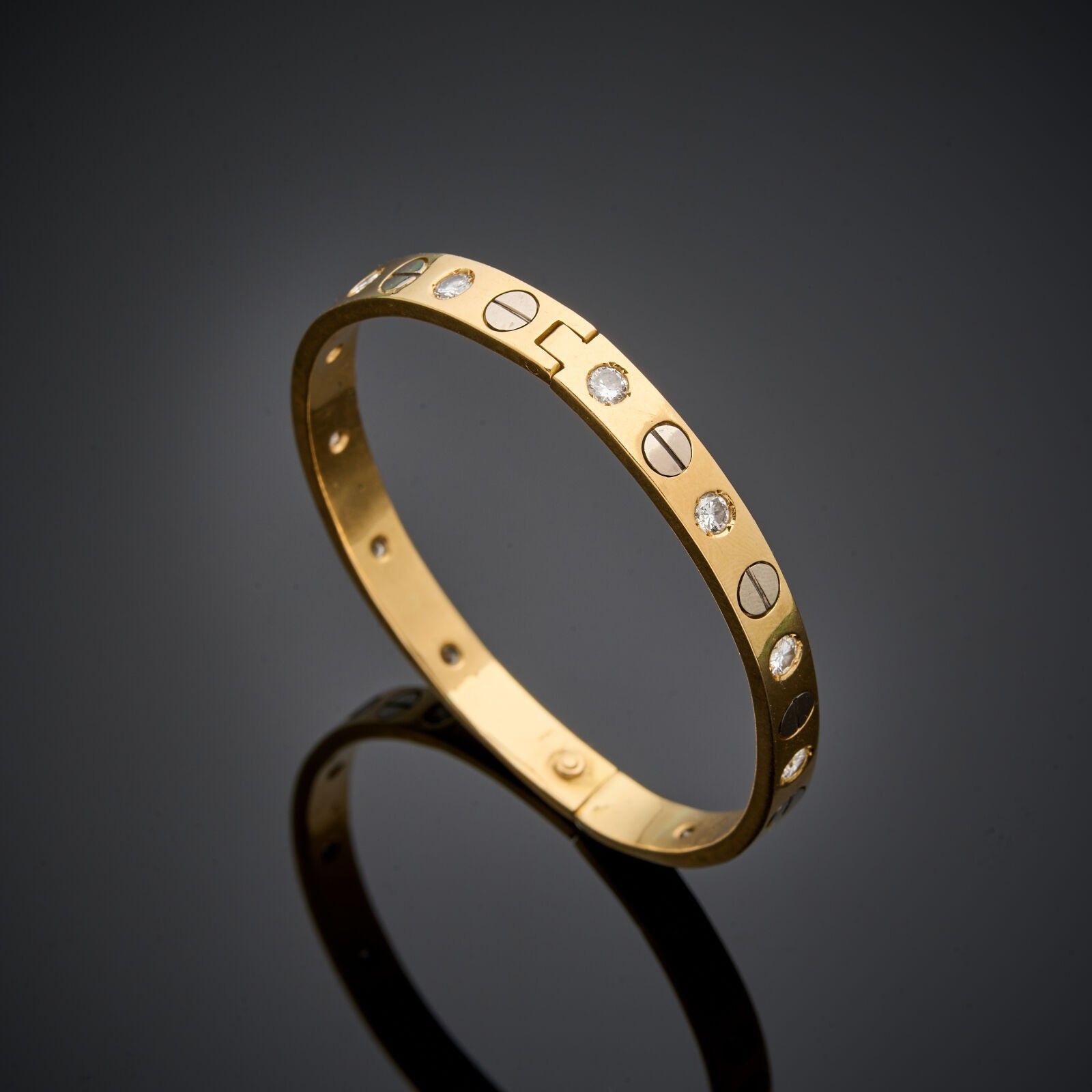 LOVE" rigid bracelet in 18 k (750 thousandths) yellow gold and white gold studs, alternated with 12 diamonds of approximately 0.2 carats.