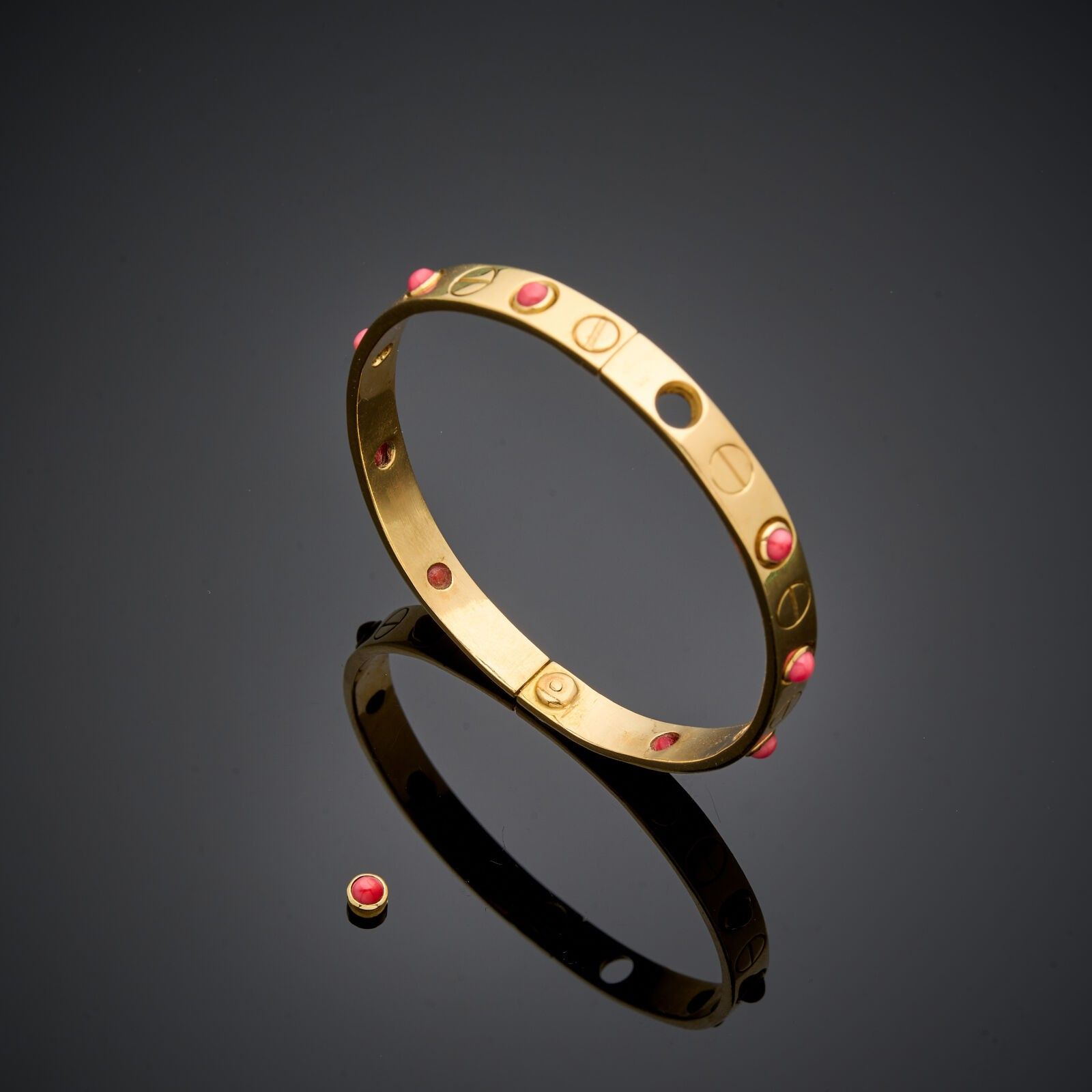 LOVE" rigid bracelet in 18 k (750 thousandths) yellow gold alternating with coral cabochons (one coral cabochon to be reattached).
