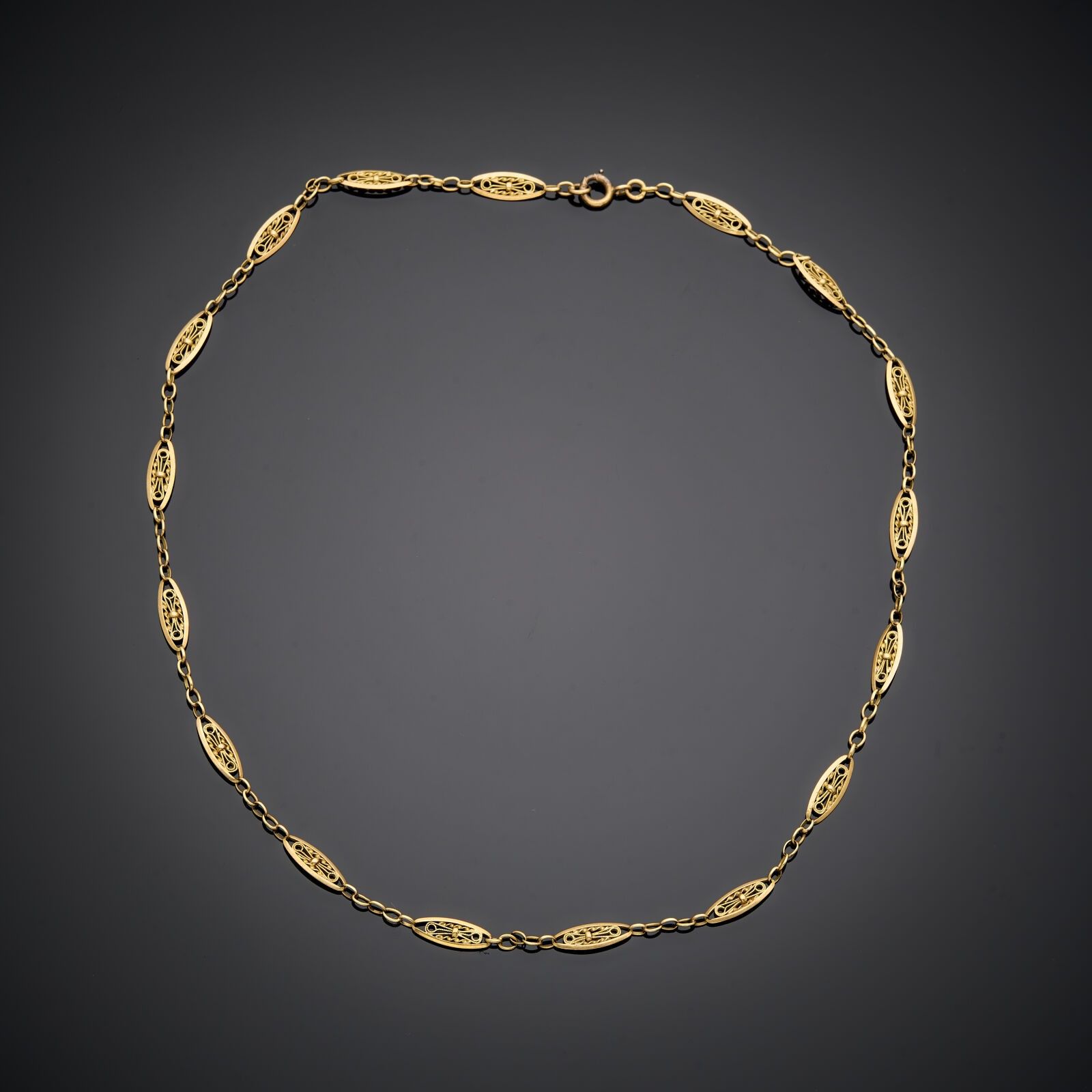 Necklace in 18 k yellow gold (750 thousandths) with filigree stitching and spring-ring clasp.