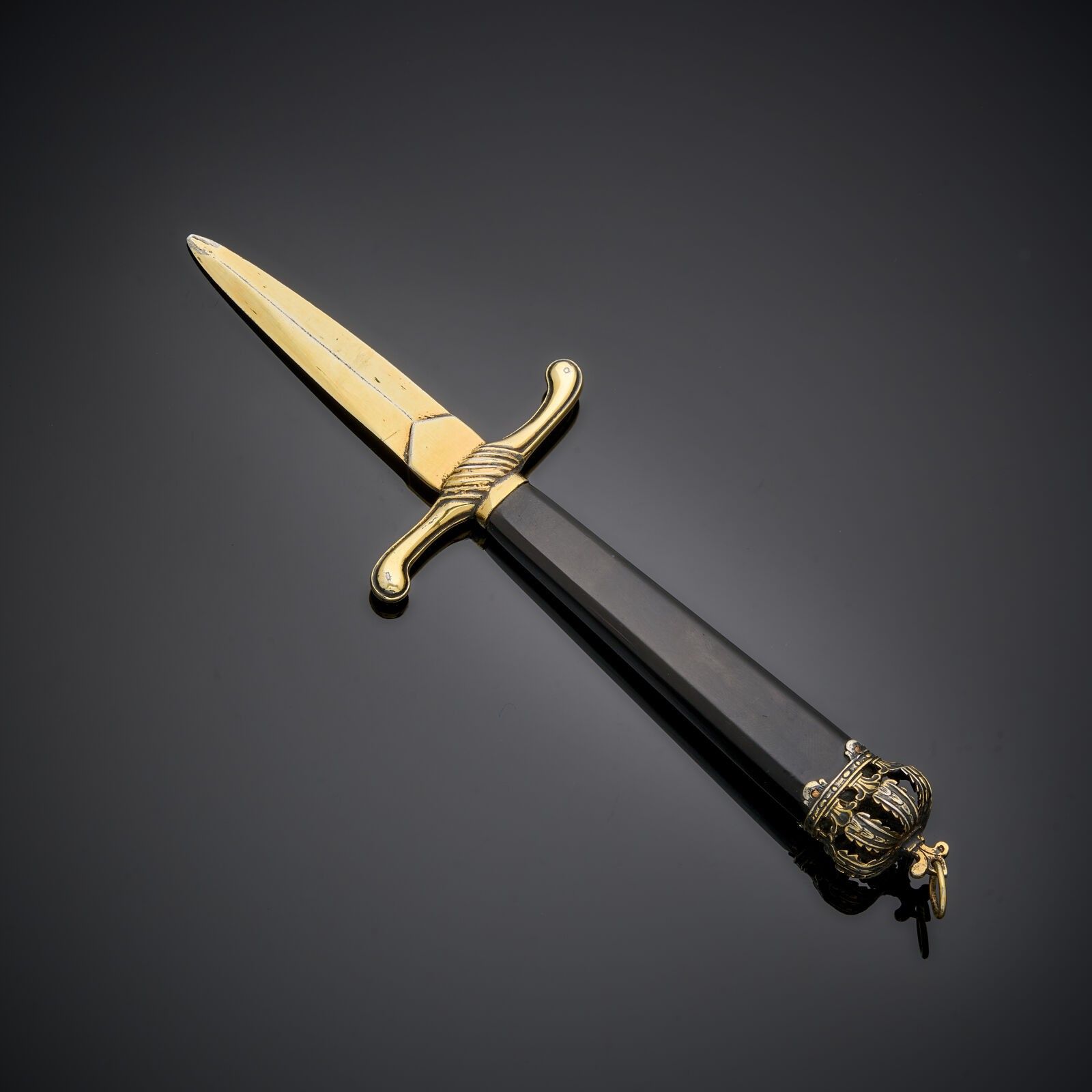 Letter opener in the form of a short-bladed vermeil (800 thousandths) and blackened wood dagger, the pommel in the form of a crown terminating in a fleur-de-lys.