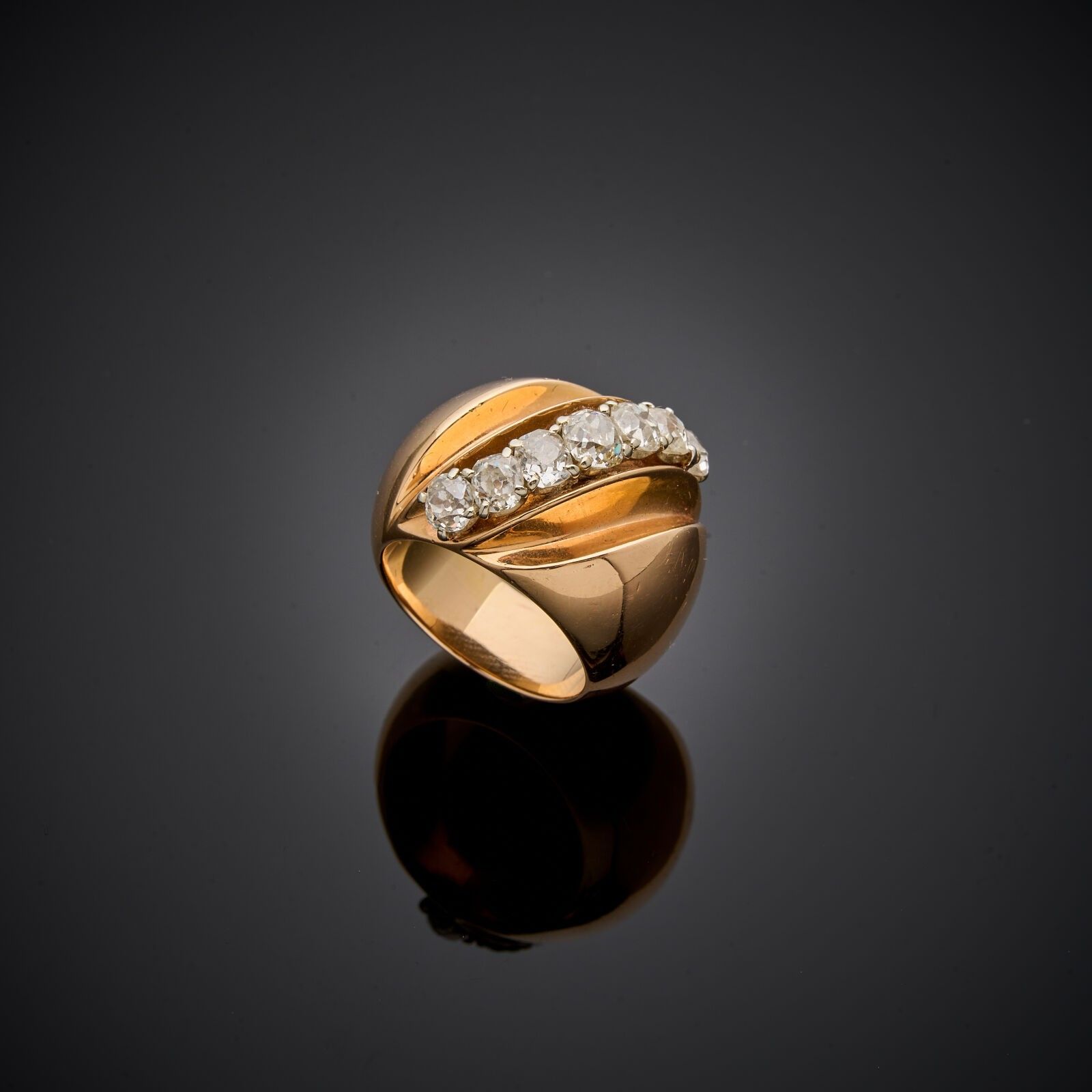 Large 18 k (750 thousandths) yellow gold ring set with a line of seven falling old-cut diamonds.