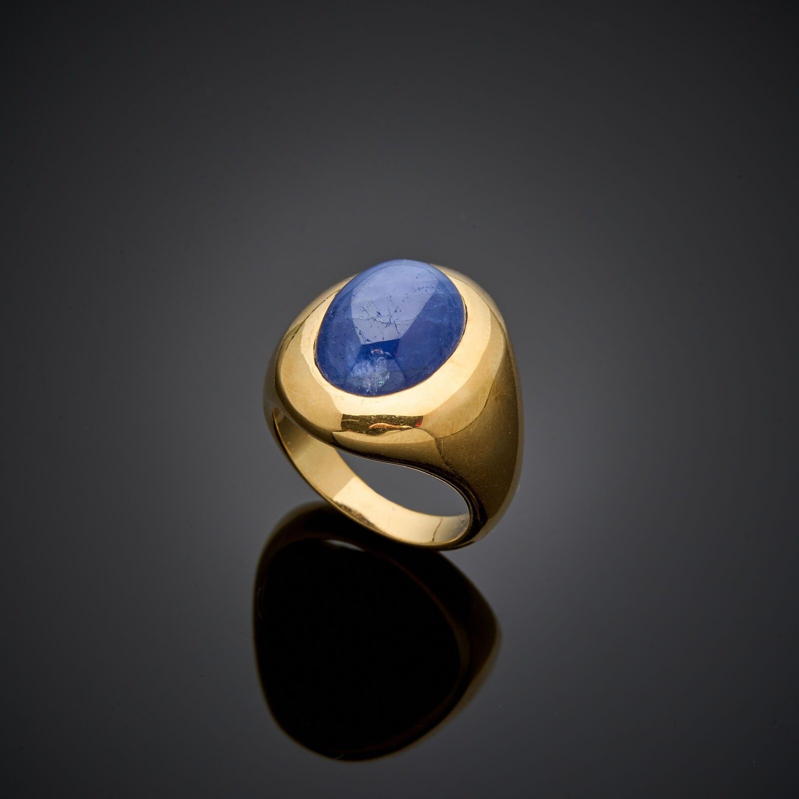 18 k (750 thousandths) yellow gold ring set with a sapphire cabochon.