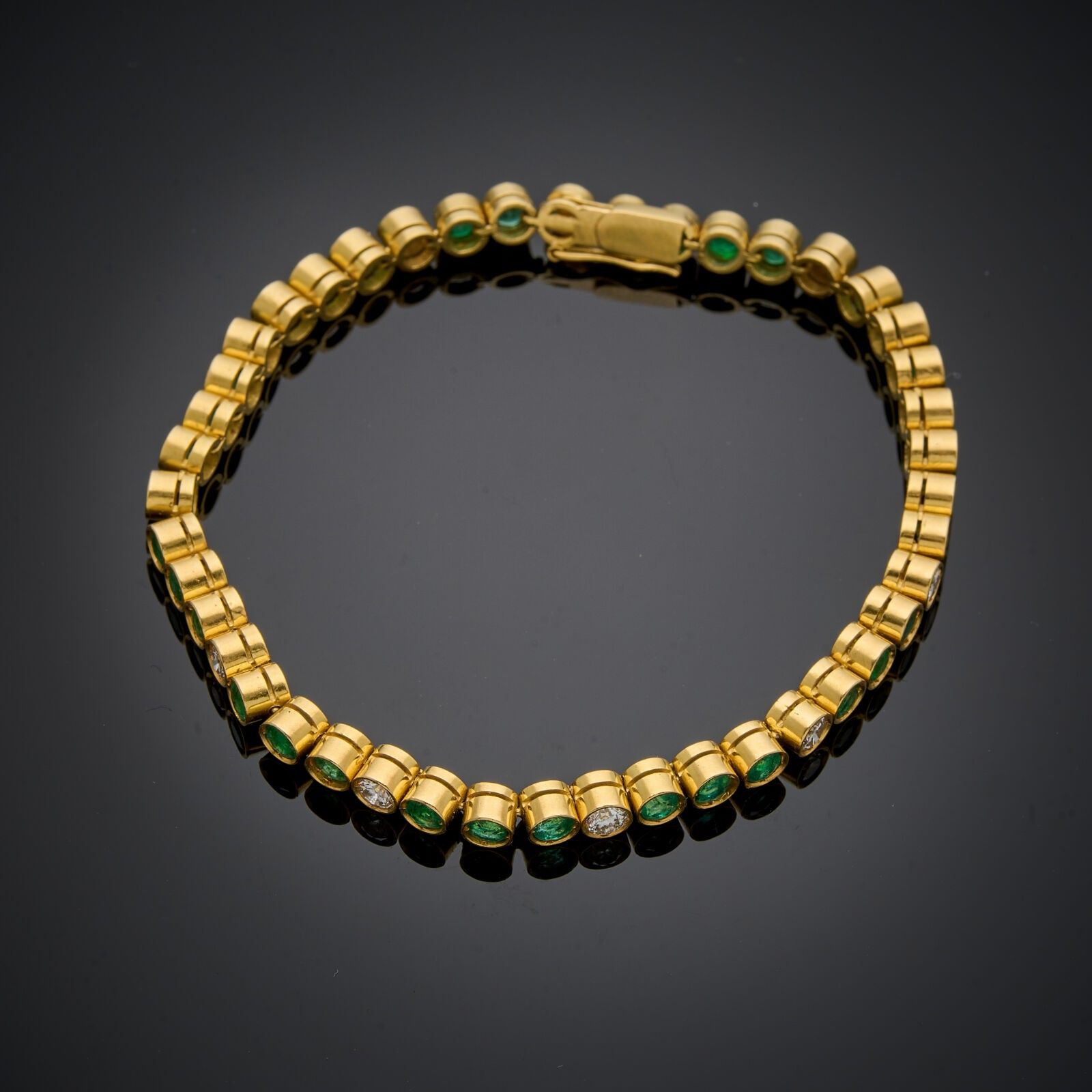 Articulated line bracelet in 18 k (750 thousandths) yellow gold set with alternating round emeralds and diamonds.