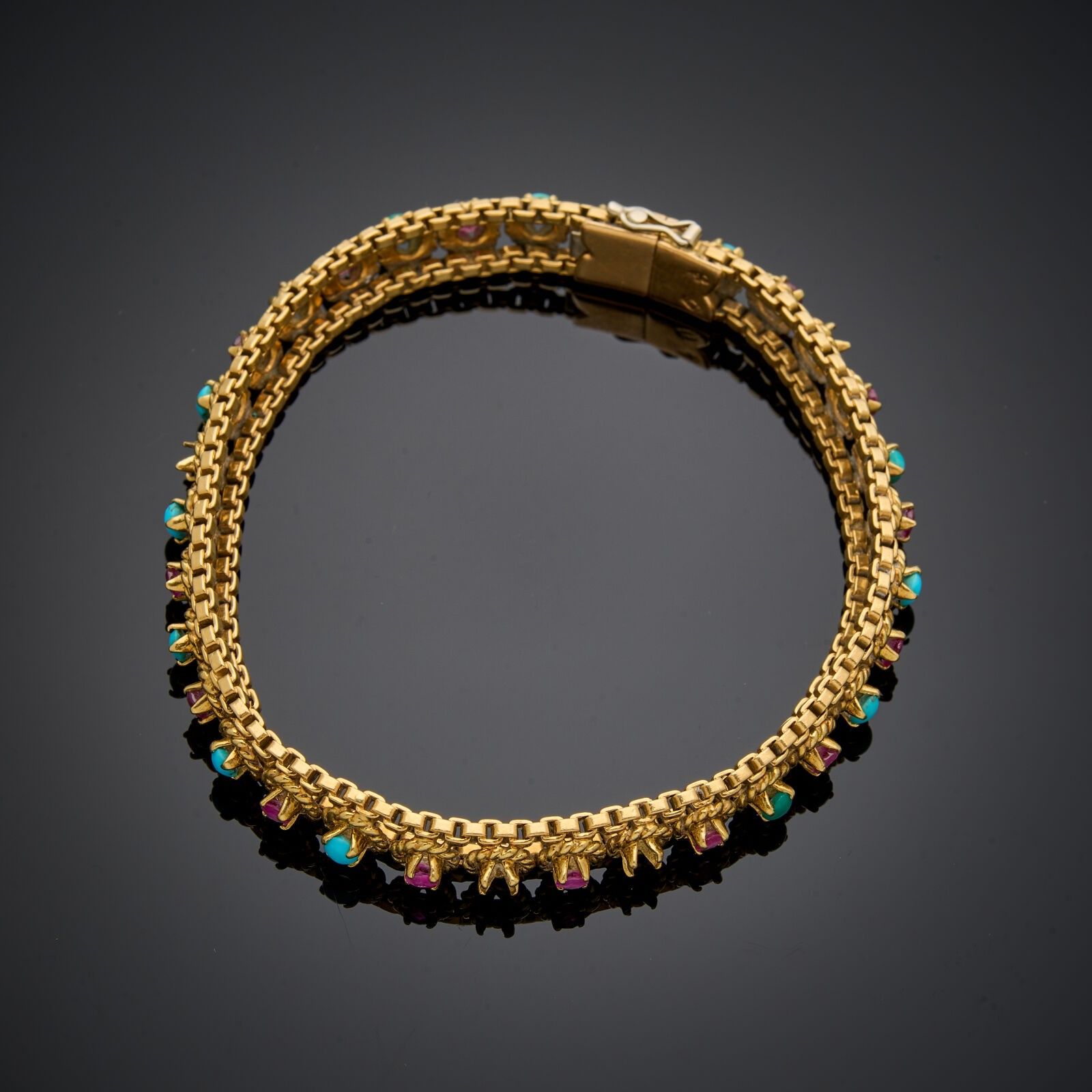 Line bracelet in 18 k yellow gold (750 thousandths) with flexible mesh set with alternating turquoise and ruby cabochons (one ruby and 4 turquoises missing).