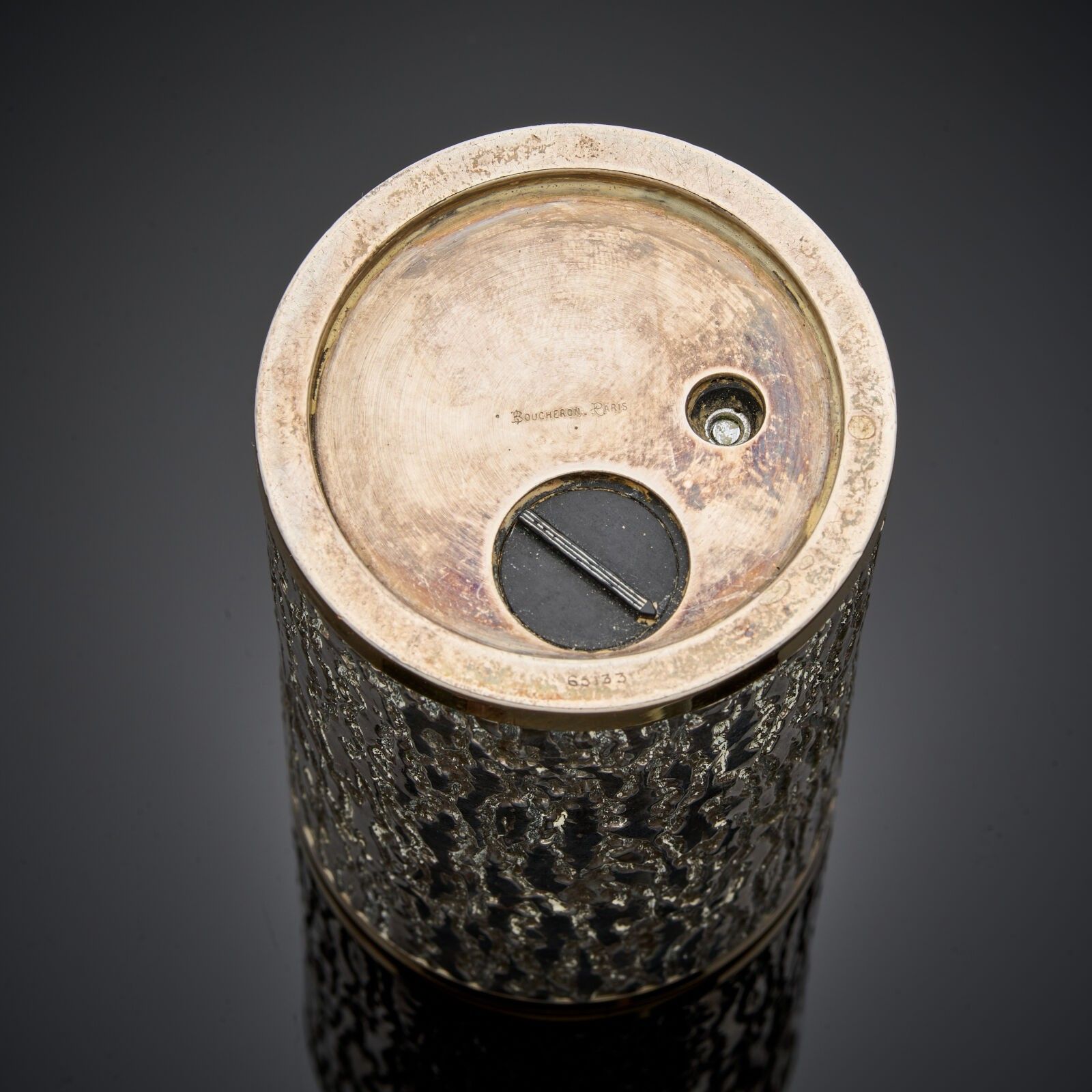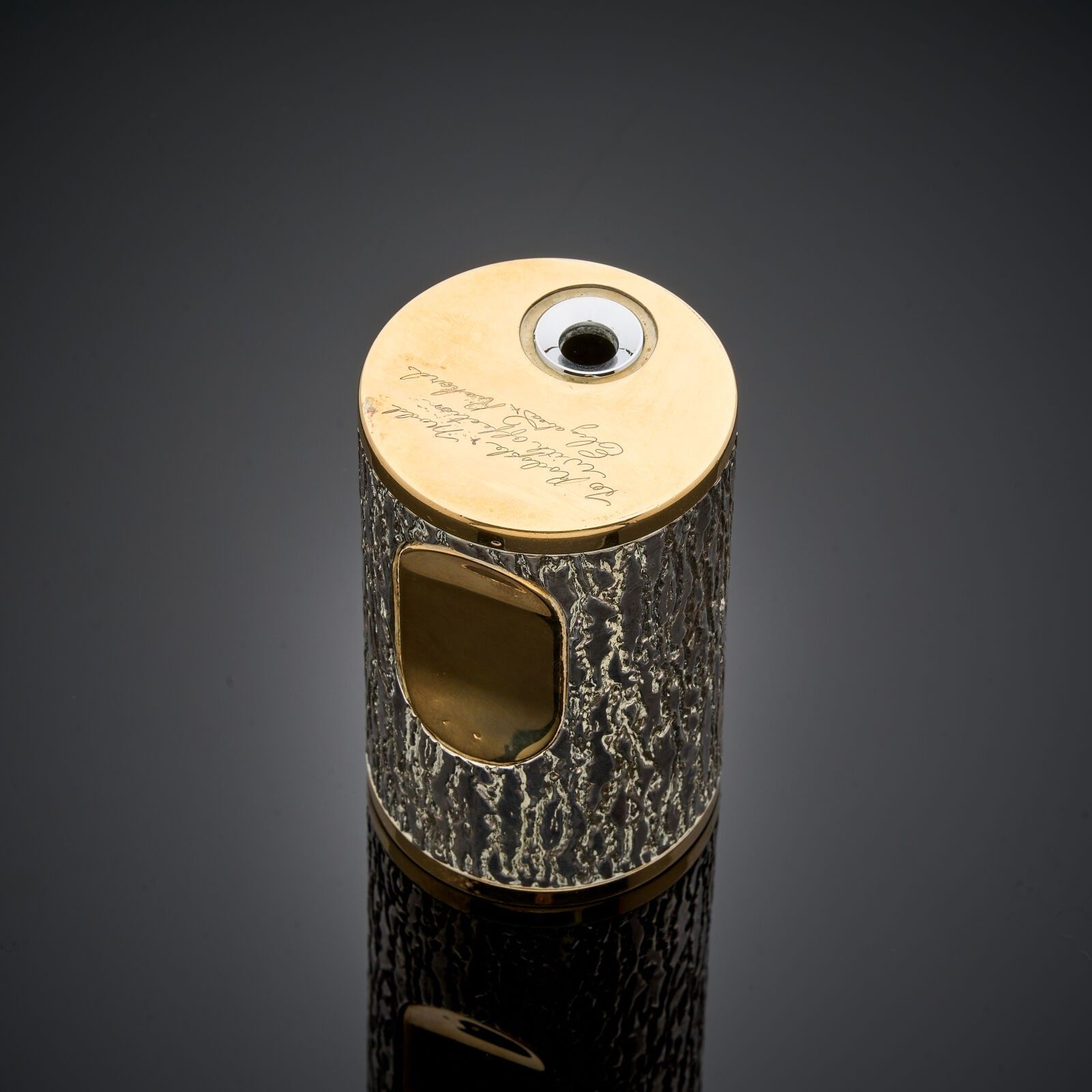 BOUCHERON Paris - Table lighter in 18k (750 thousandths) yellow gold and silver, cylindrical with imitation bark decoration. Dedicated "To Rodolphe & Madel with affection Elysabeth & Richard".