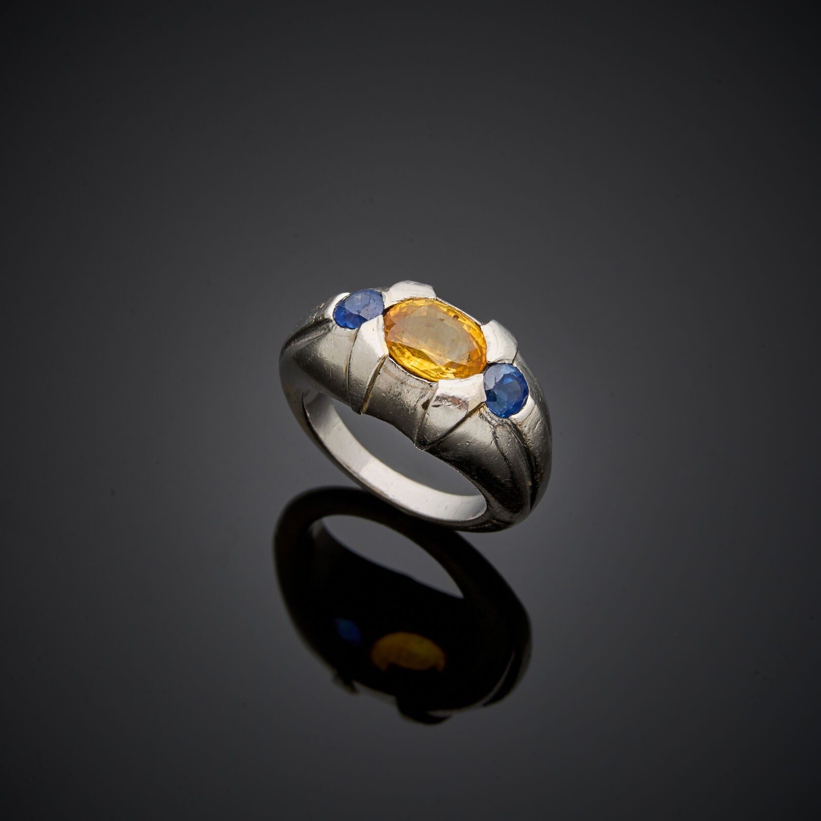 18k (750 thousandths) white gold and platinum ring set with a yellow sapphire and blue sapphires.