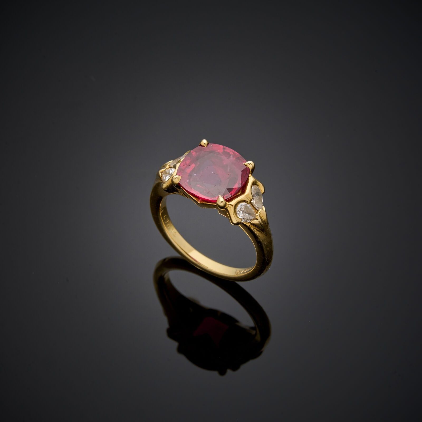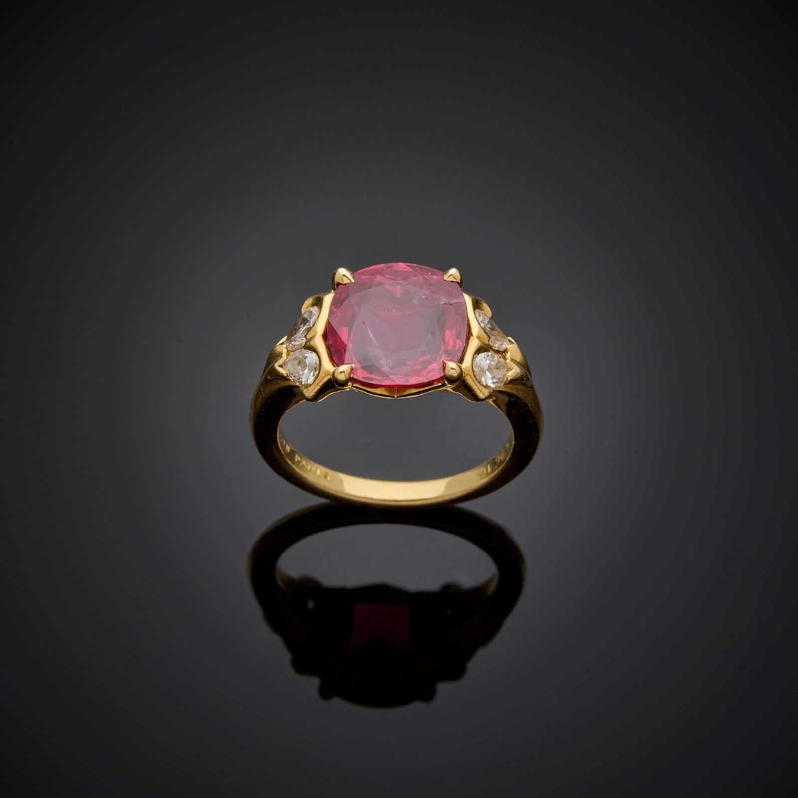 MAUBOUSSIN - Ring in 18 k (750 thousandths) yellow gold set with a cushion ruby weighing 3.8 carats, with two diamonds on either side.
