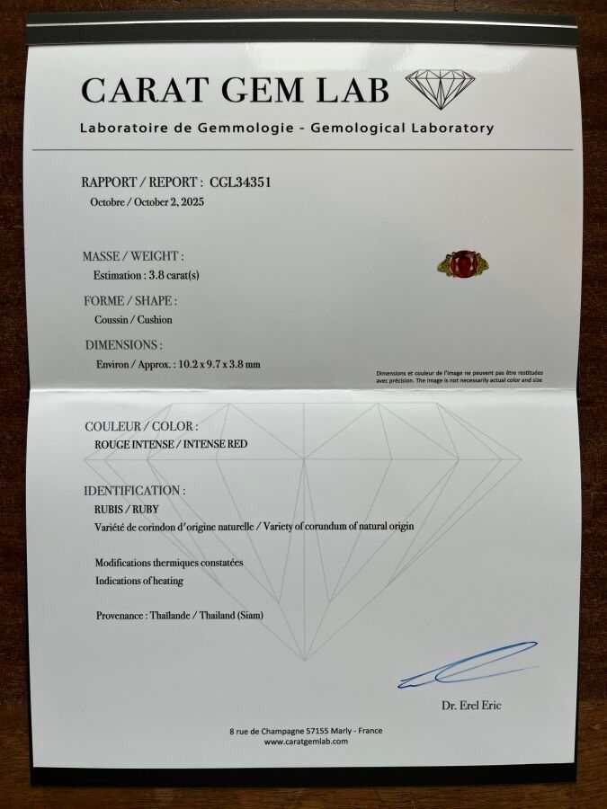 CGL certificate dated 2 October 2025 N° CGL34351 indicating natural ruby "intense red", cushion shape, approx. 3.8 carats, SIAM thermal modifications noted.