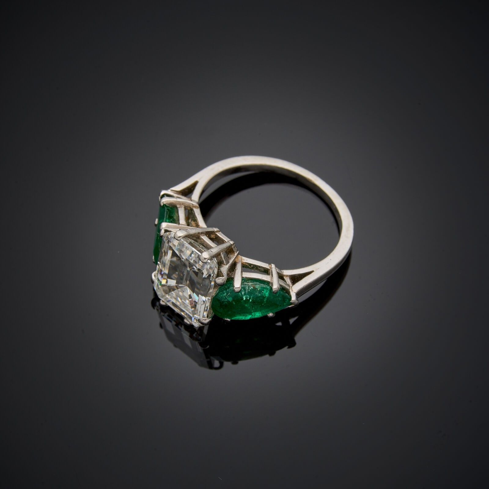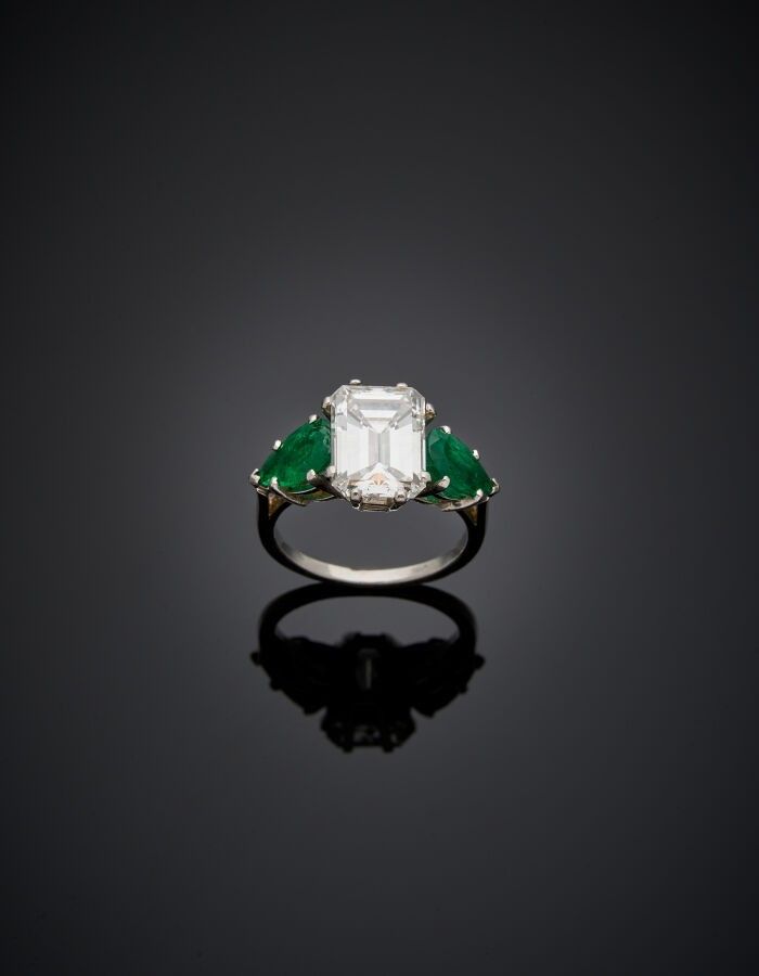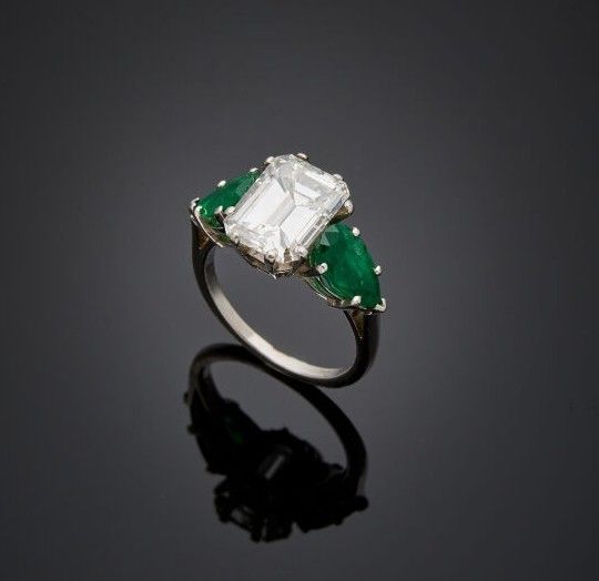 Suzanne BELPERRON (1900-1983) - Ring in platinum (900 thousandths) set with a 3.70 carat emerald-cut diamond and two pear-cut emeralds.