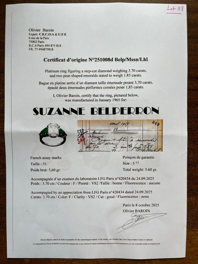 Certificate from Olivier Baroin C.EC.O.A. & U.F.E. expert dated 8 October 2025 N°251008d indicating that the ring was produced for Suzanne Belperron in January 1965 (see reproduction).