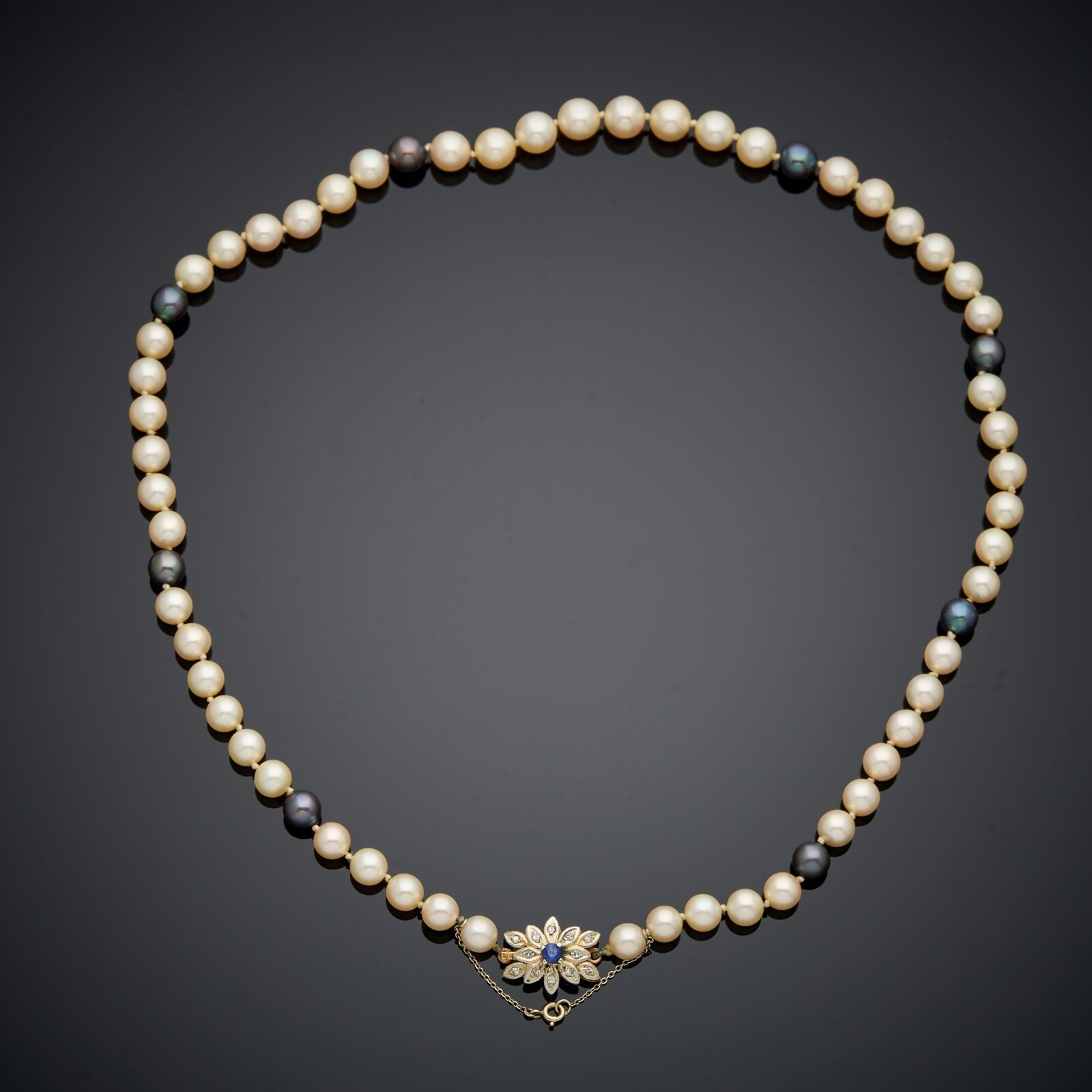Necklace of white cultured pearls alternating with black pearls, clasp in 18k (750 thousandths) white and yellow gold set with a sapphire and diamonds on the petals.