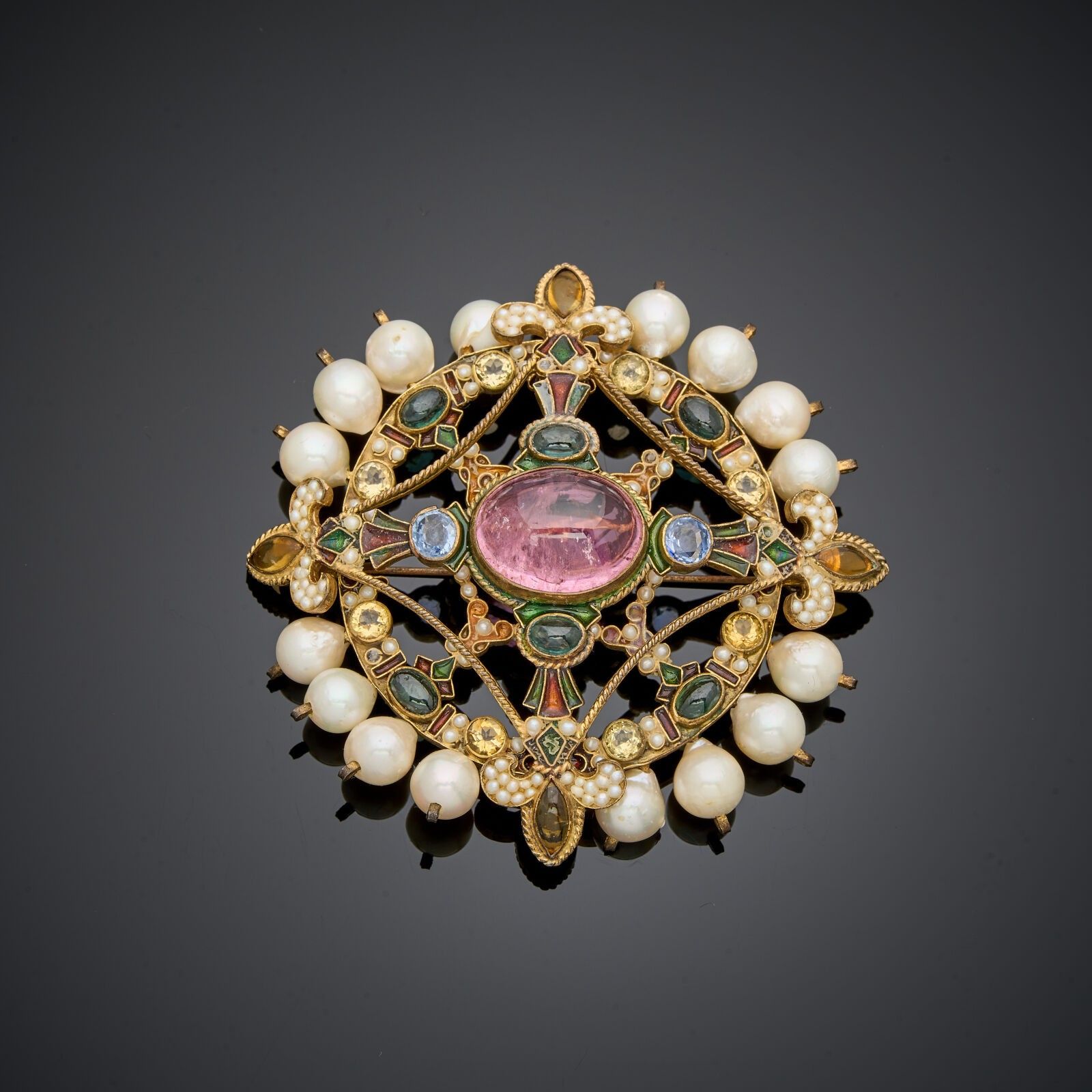 PERCOSSI PAPI - Circular neo-Renaissance brooch in gilt and enamelled metal, centred on a pink stone cabochon framed by pearls.