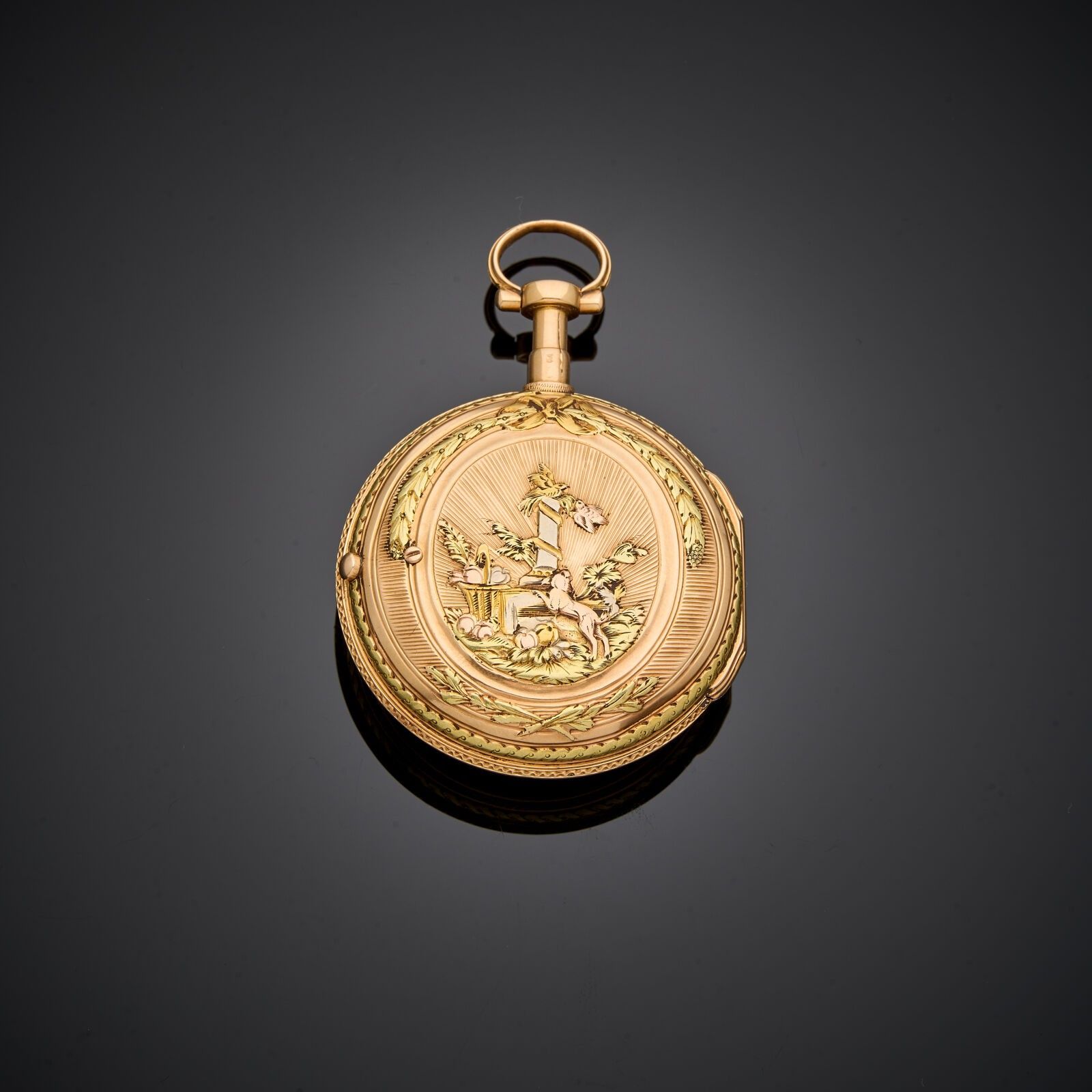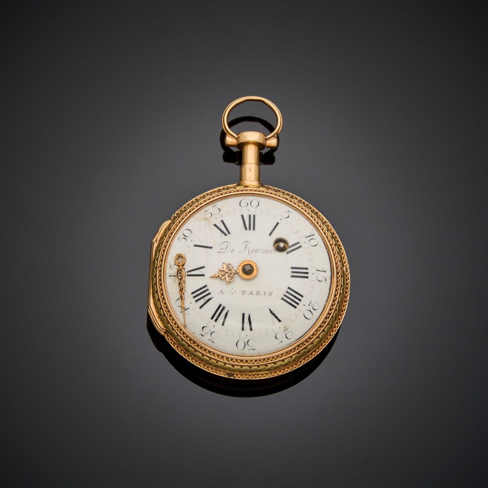 Three 18k (750 thousandths) gold gousset watch with rich repoussé decoration of the Temple of Love in a laurelled and ribboned medallion. White enamelled dial with Roman numerals for the hours and Arabic numerals for the minutes. Cock movement signed "de RONZIERS" "à Paris", the dial also.