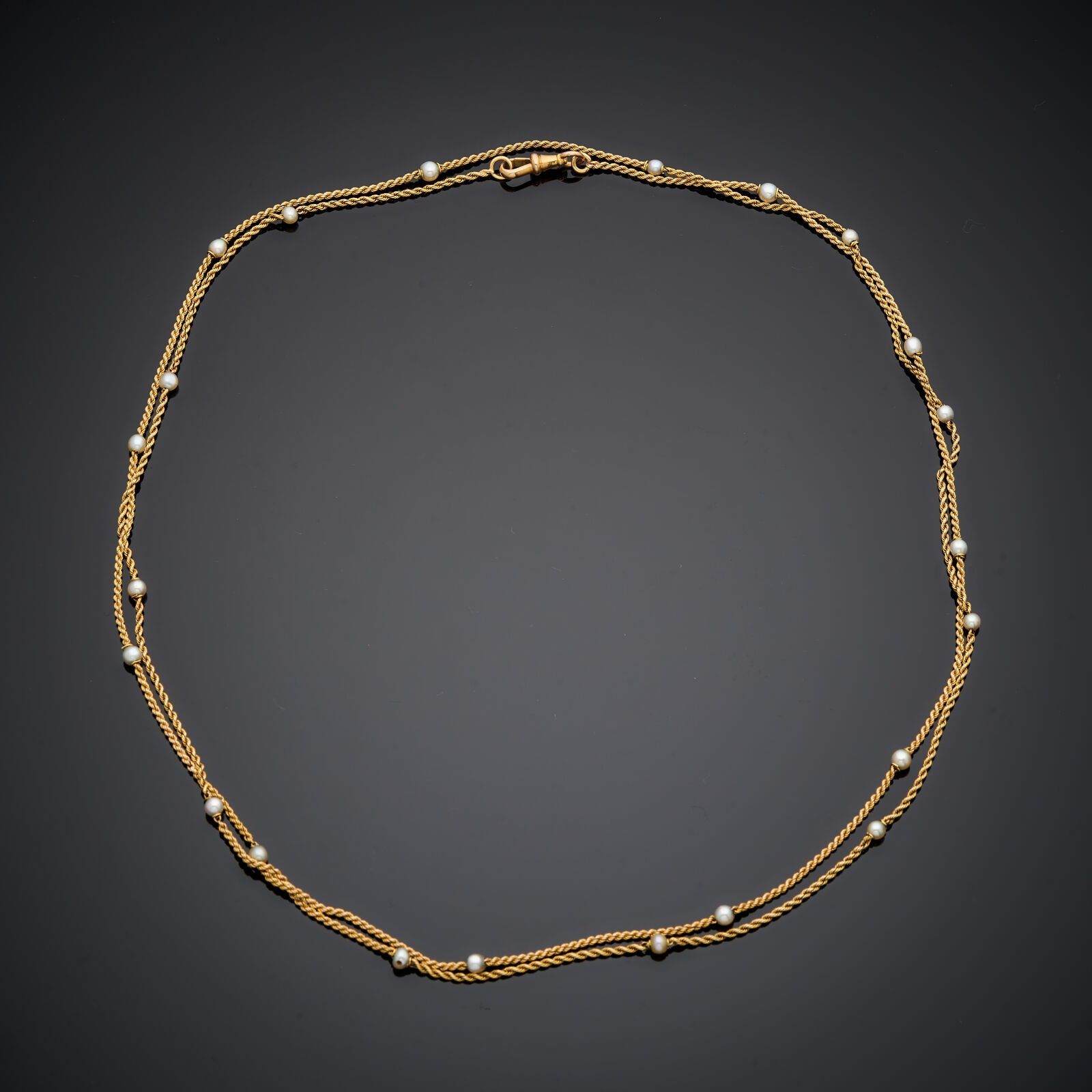 18 k (750 thousandths) yellow gold sautoir watch chain decorated with probably fine pearls.